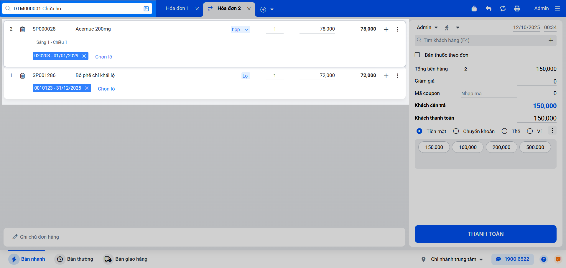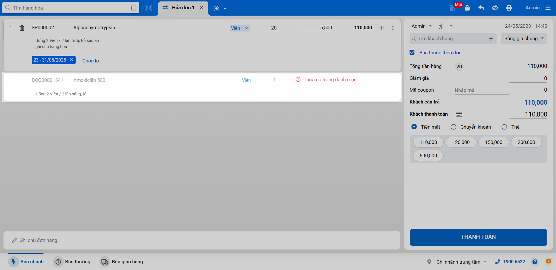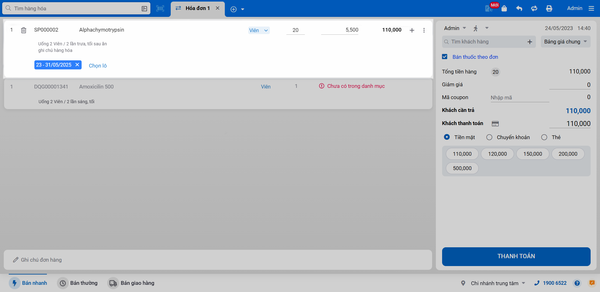 - Sau khi chọn lô, thuốc sẽ được thêm vào hóa đơn để tiến hành thanh toán.