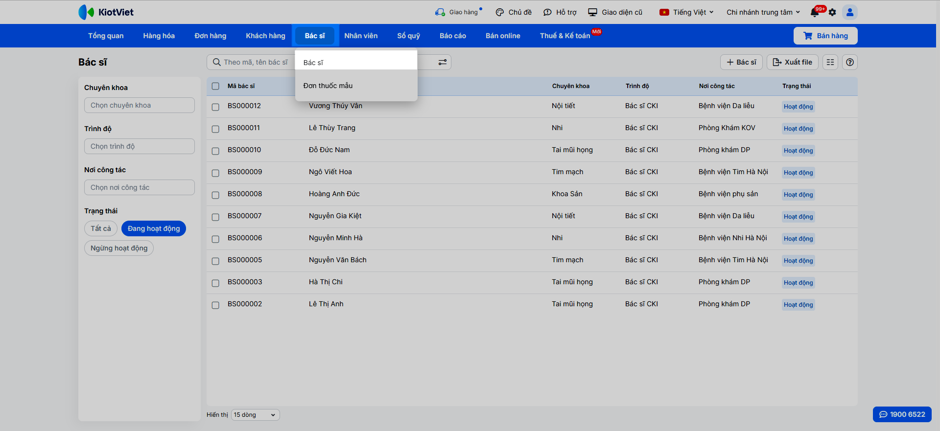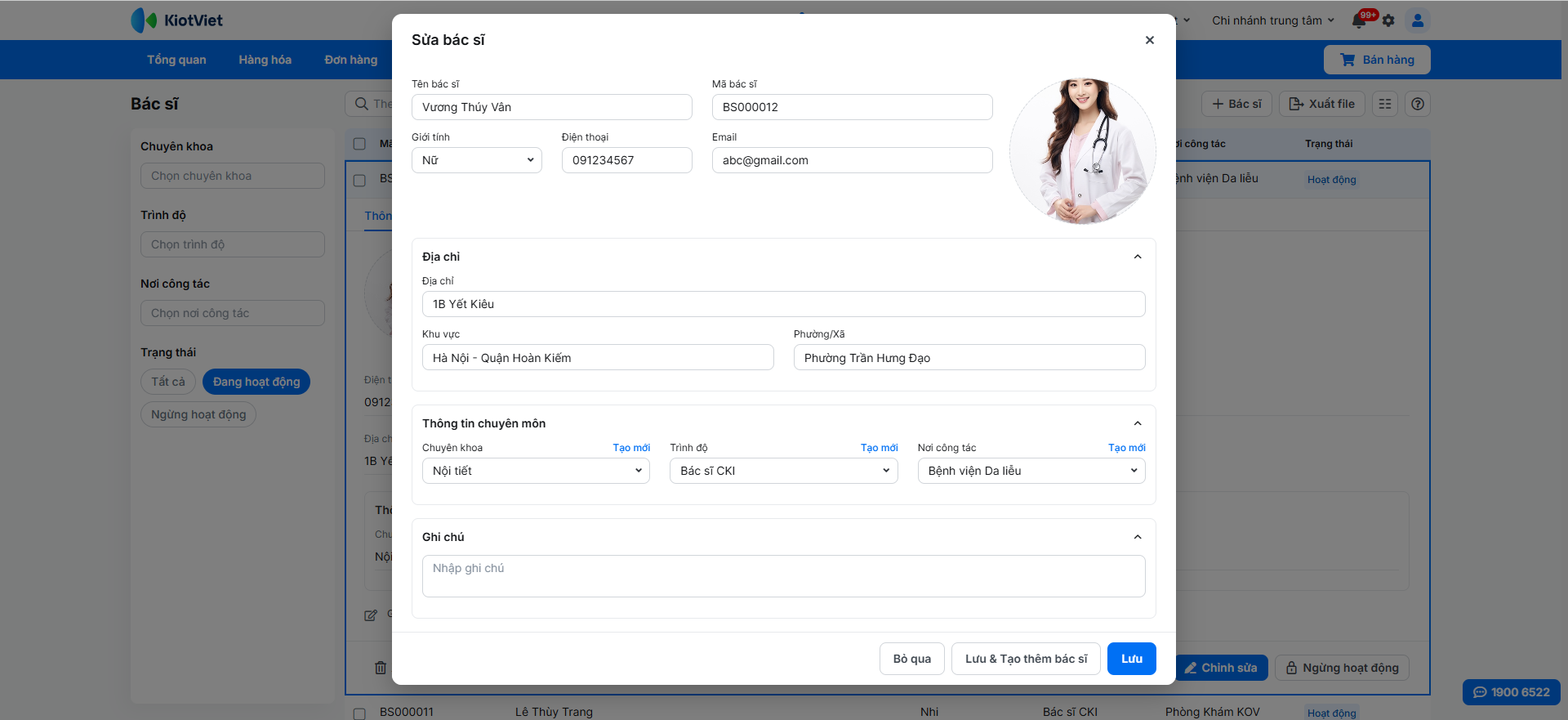 - Thao tác thực hiện như sau: Bạn vào menu Bác sĩ để thêm mới hoặc chỉnh sửa thông tin chi tiết (tên, số điện thoại, chuyên khoa, nơi công tác…).