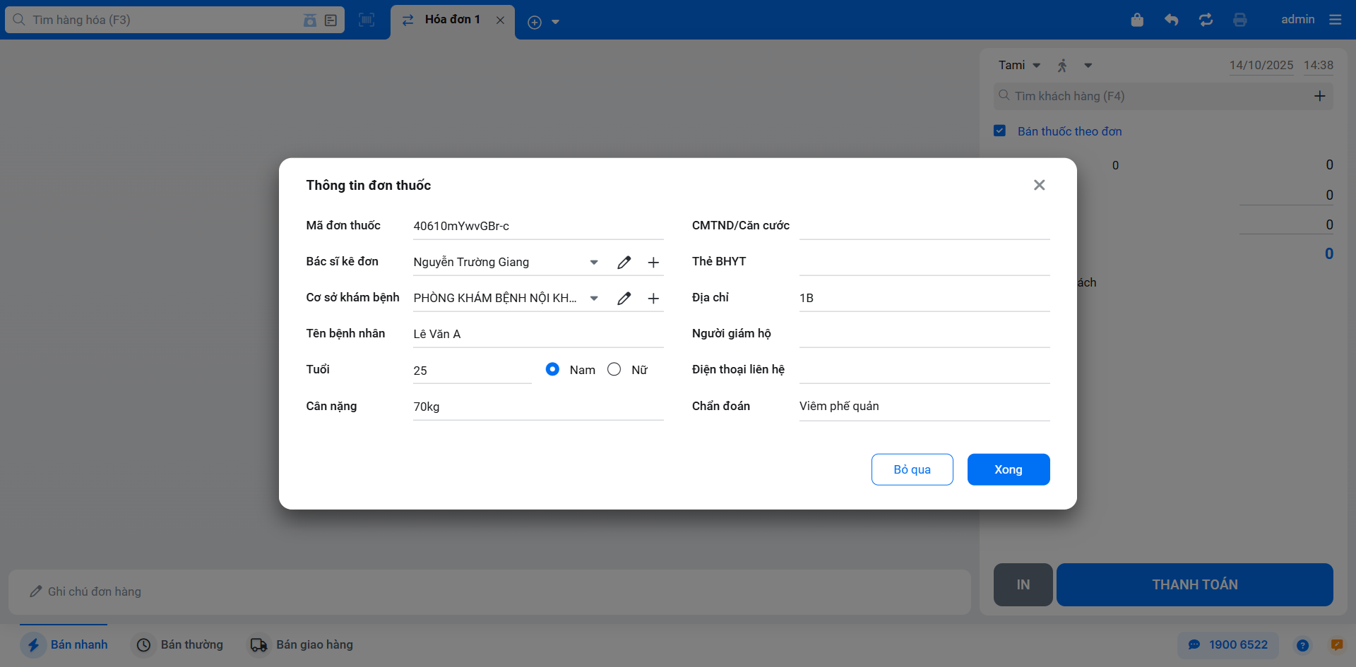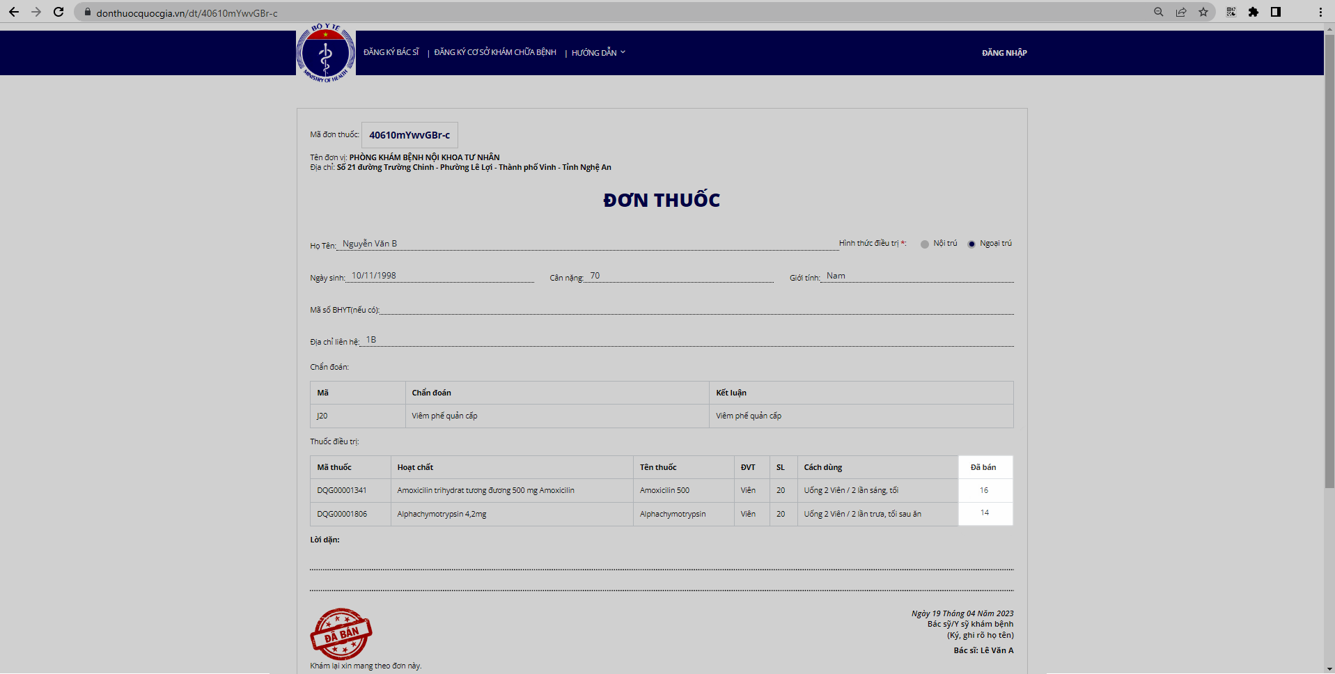 - Nếu mã hợp lệ, hệ thống sẽ tự động điền các thông tin trên đơn thuốc, bao gồm: