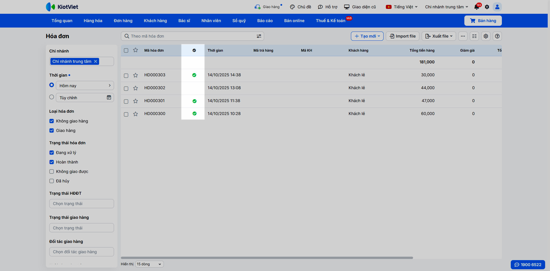 - Trên danh sách các giao dịch (ví dụ: Hóa đơn), những phiếu đã được đồng bộ sẽ có biểu tượng tích v xanh