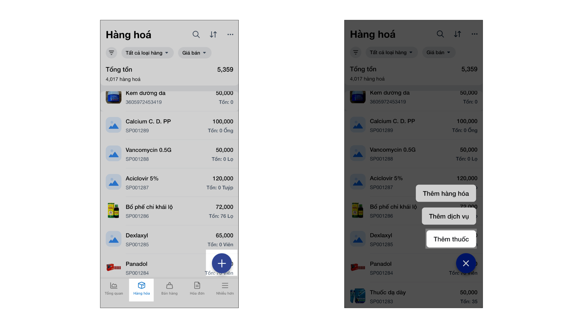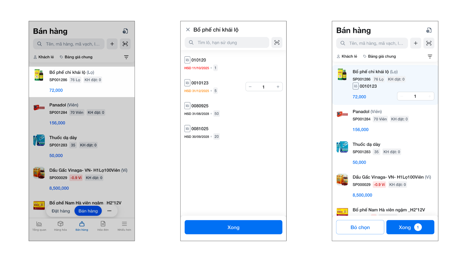 - Tình huống: Bạn cần tạo hóa đơn cho khách và chọn đúng lô thuốc cần bán ngay trên điện thoại.