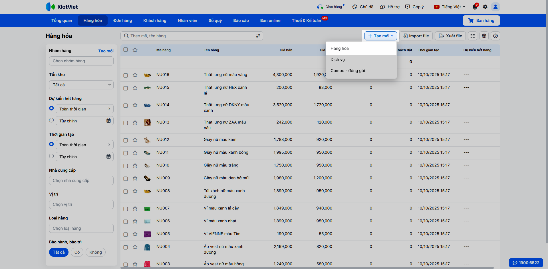- Nhấn Xong → hệ thống quay lại màn hình Tạo hàng hóa, bạn nhấn Lưu ở cuối trang.
