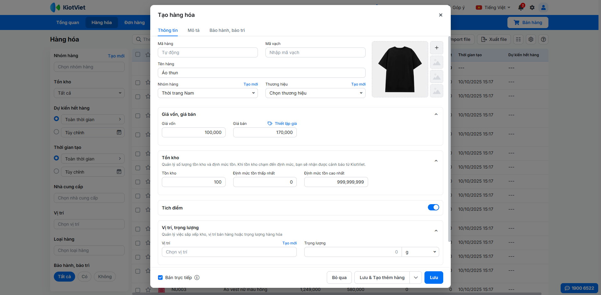 - Điền các thông tin cơ bản về sản phẩm (tên, giá bán, giá vốn, nhóm hàng…).