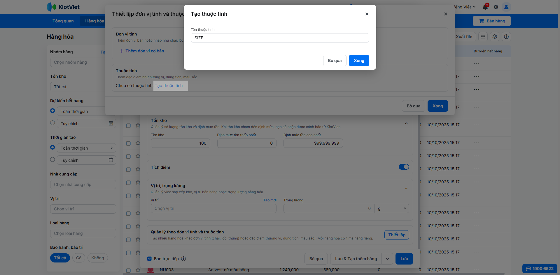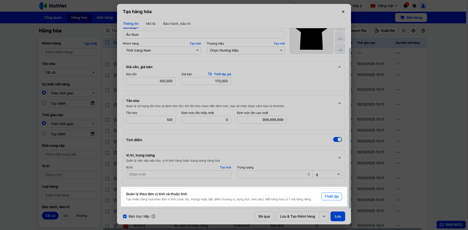 - Thêm thuộc tính: Tại mục Quản lý theo thuộc tính, đơn vị tính, nhấn Thiết lập.