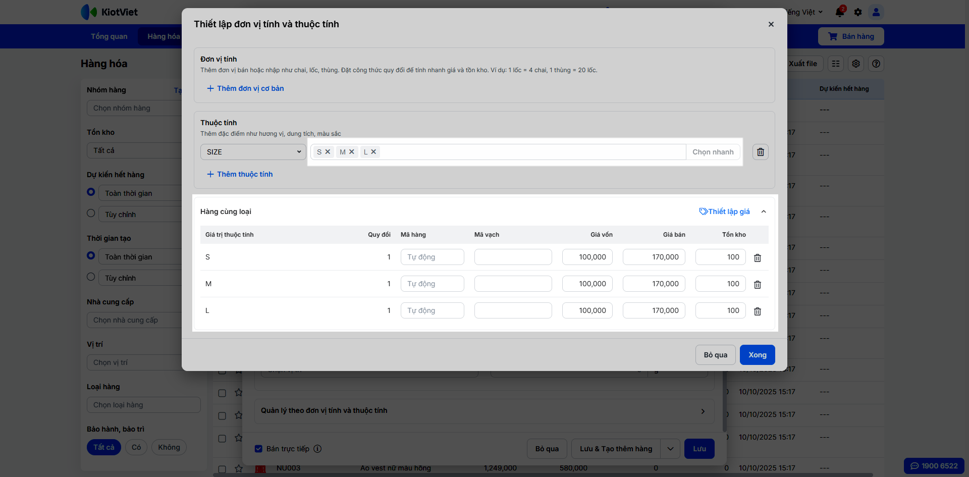 - Nhập các giá trị như “S”, “M”, “L”. Hệ thống sẽ tự động tạo các phiên bản hàng hóa tương ứng với từng size. Bạn có thể điều chỉnh giá bán hoặc giá vốn cho từng size nếu cần.