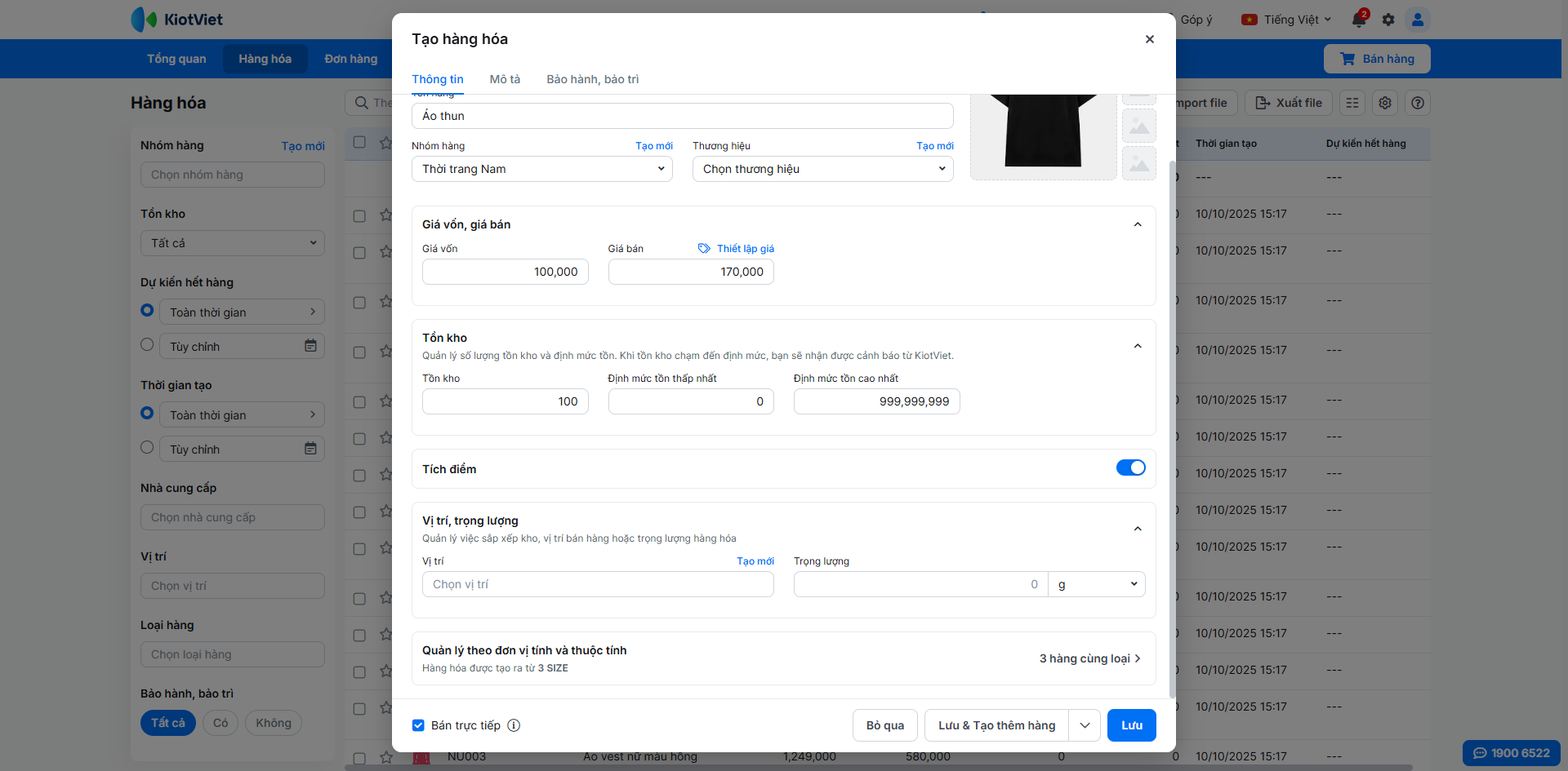 - Tình huống: Bạn cần tạo một sản phẩm mới như “Áo thun” với nhiều size khác nhau để quản lý tồn kho chính xác cho từng kích cỡ.