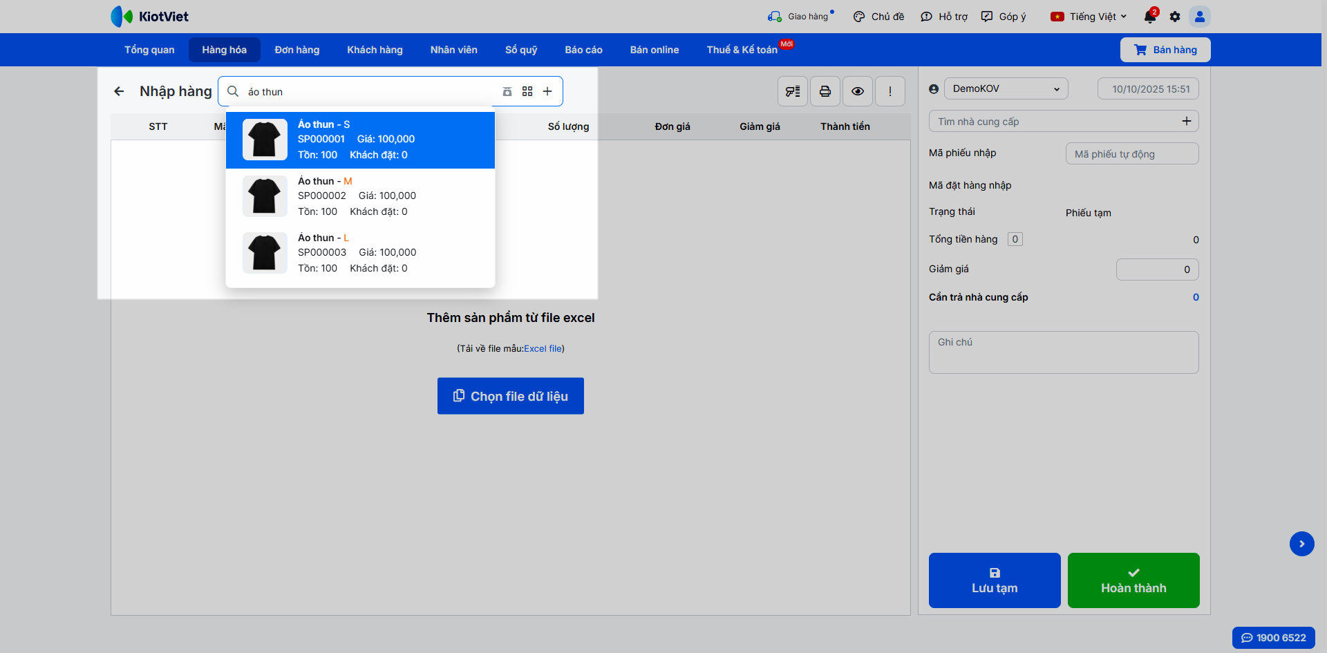 - Khi tạo phiếu Nhập hàng, bạn tìm kiếm sản phẩm “Áo thun”.