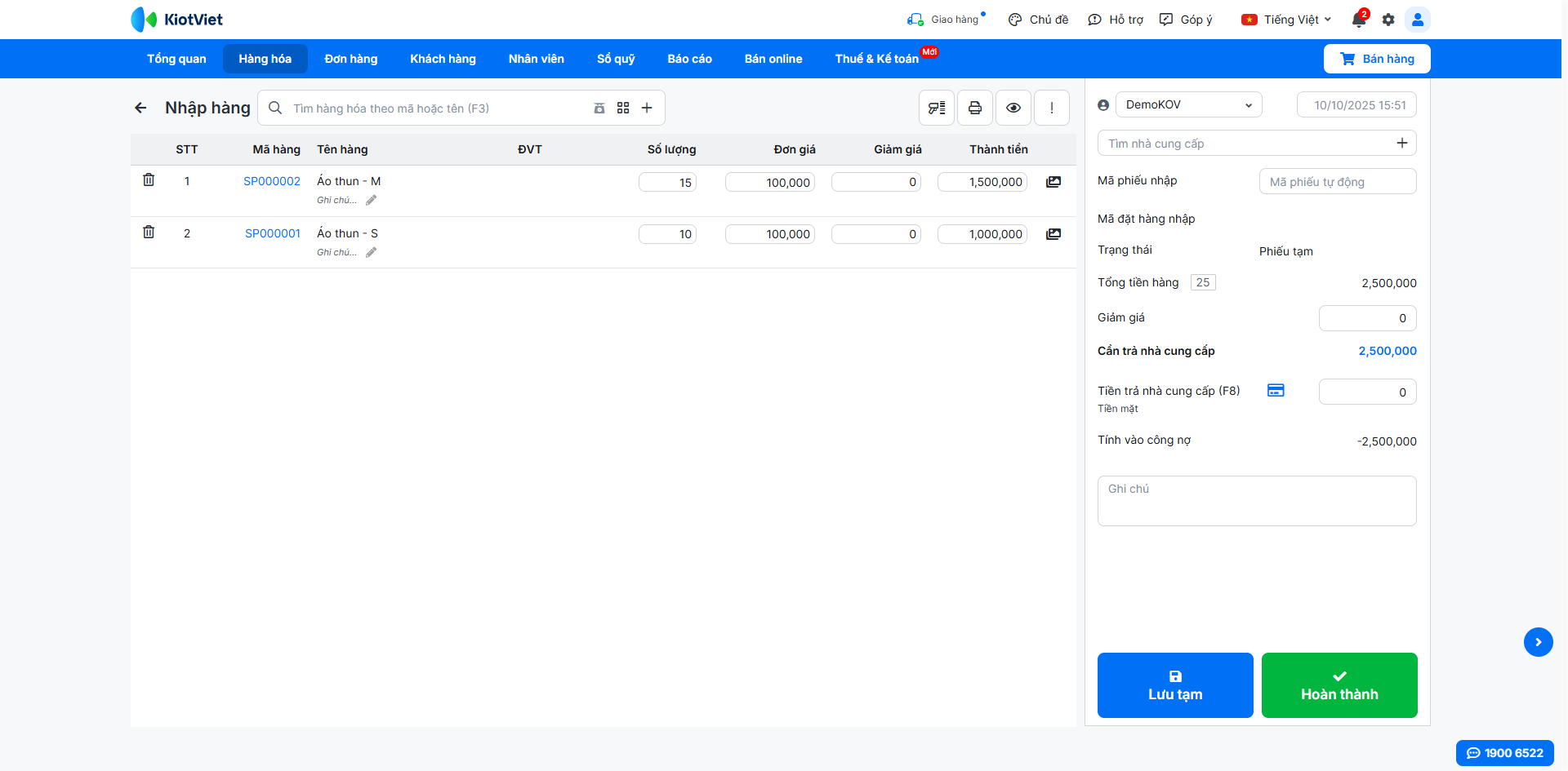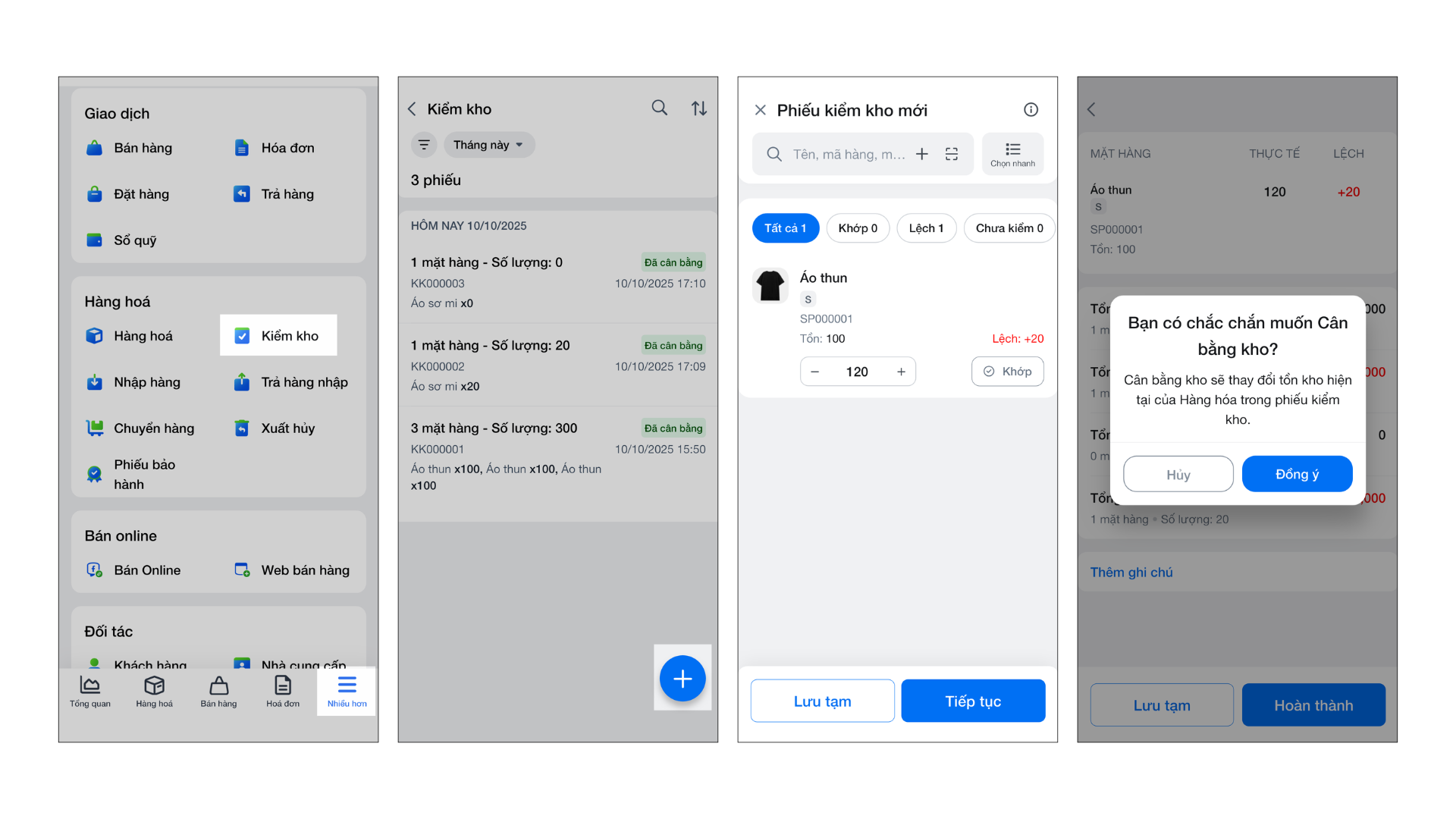 - Sau khi hoàn tất, bạn có thể lưu phiếu tạm hoặc hoàn thành để cân bằng lại tồn kho.