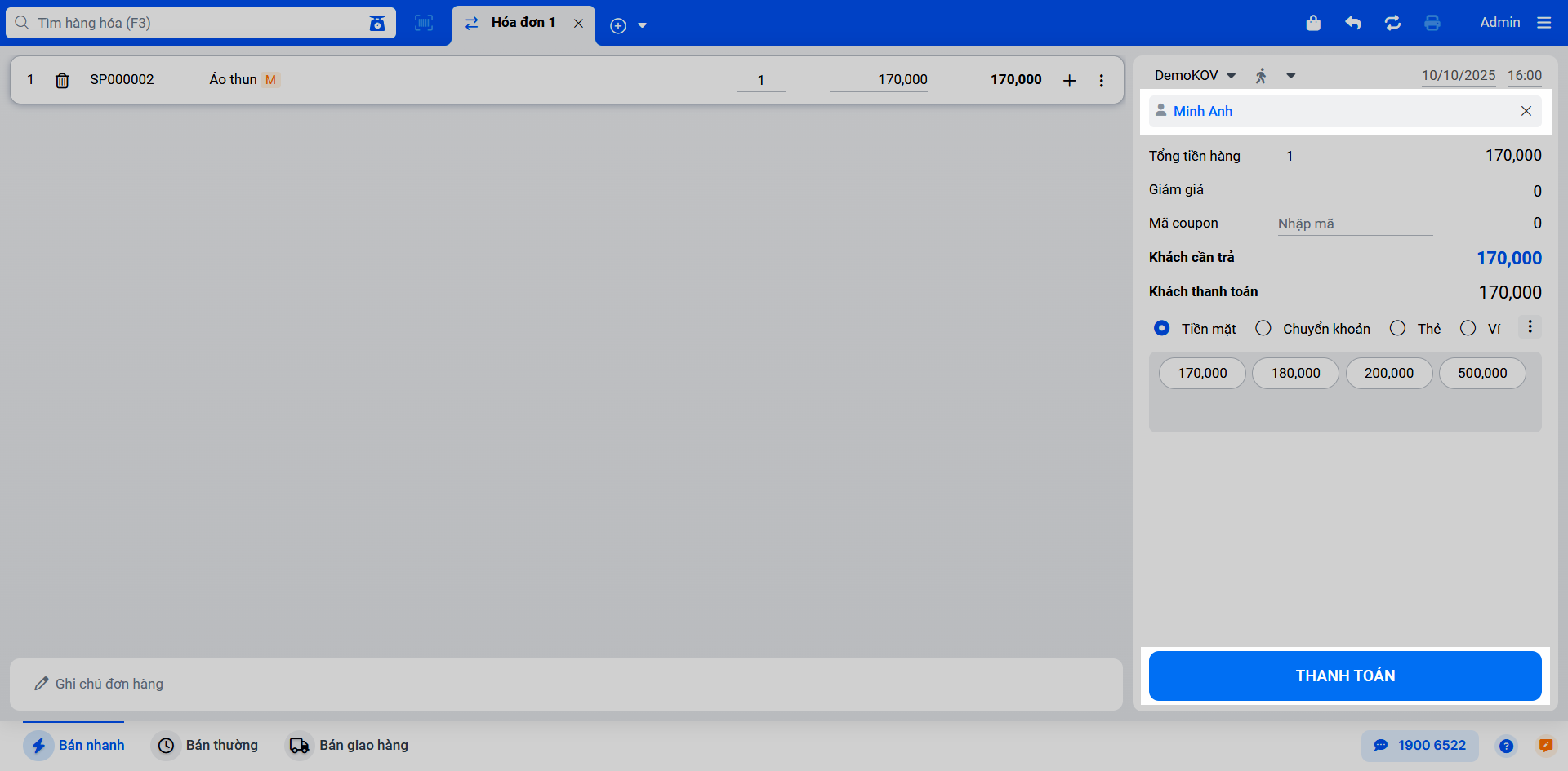 - Thêm thông tin khách hàng vào hóa đơn để hệ thống tự động tích điểm khi hóa đơn đủ điều kiện.
