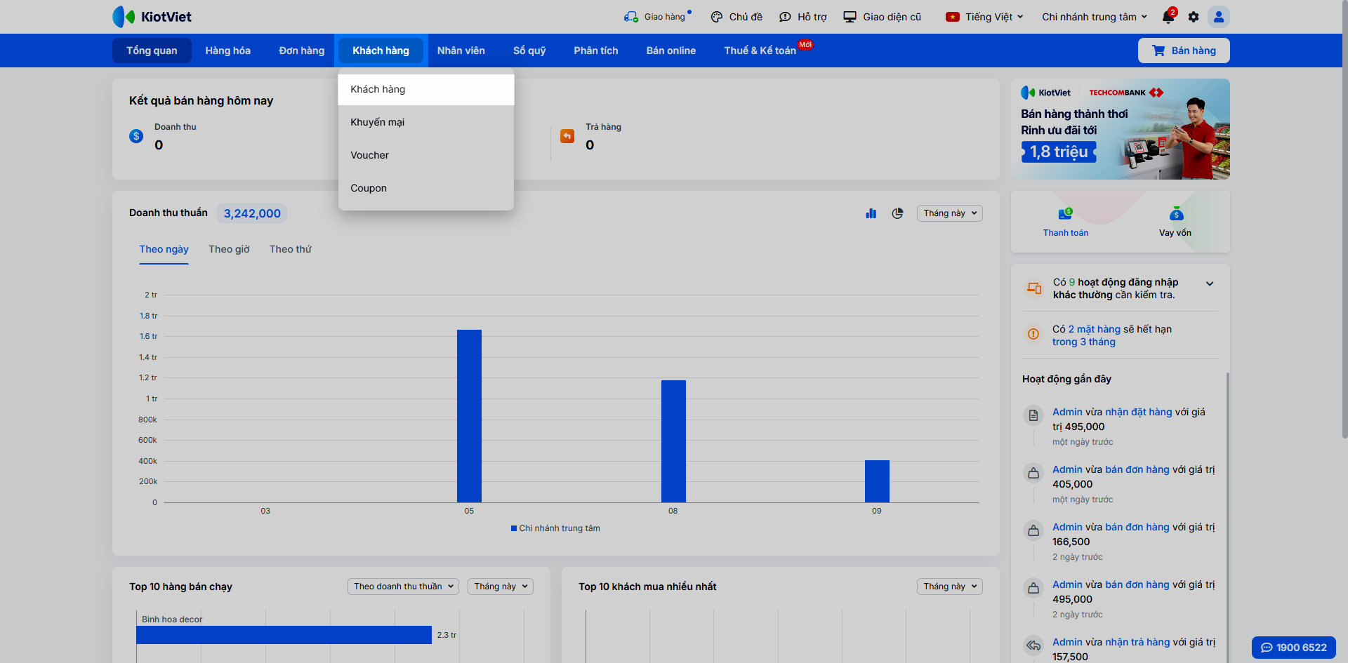 - Tối ưu hóa bán hàng và chăm sóc khách hàng: Nhanh chóng tạo các chương trình khuyến mại, kết hợp với các chính sách giá và chương trình tích điểm, phân nhóm khách hàng tự động để giữ chân khách hàng và gia tăng doanh thu.