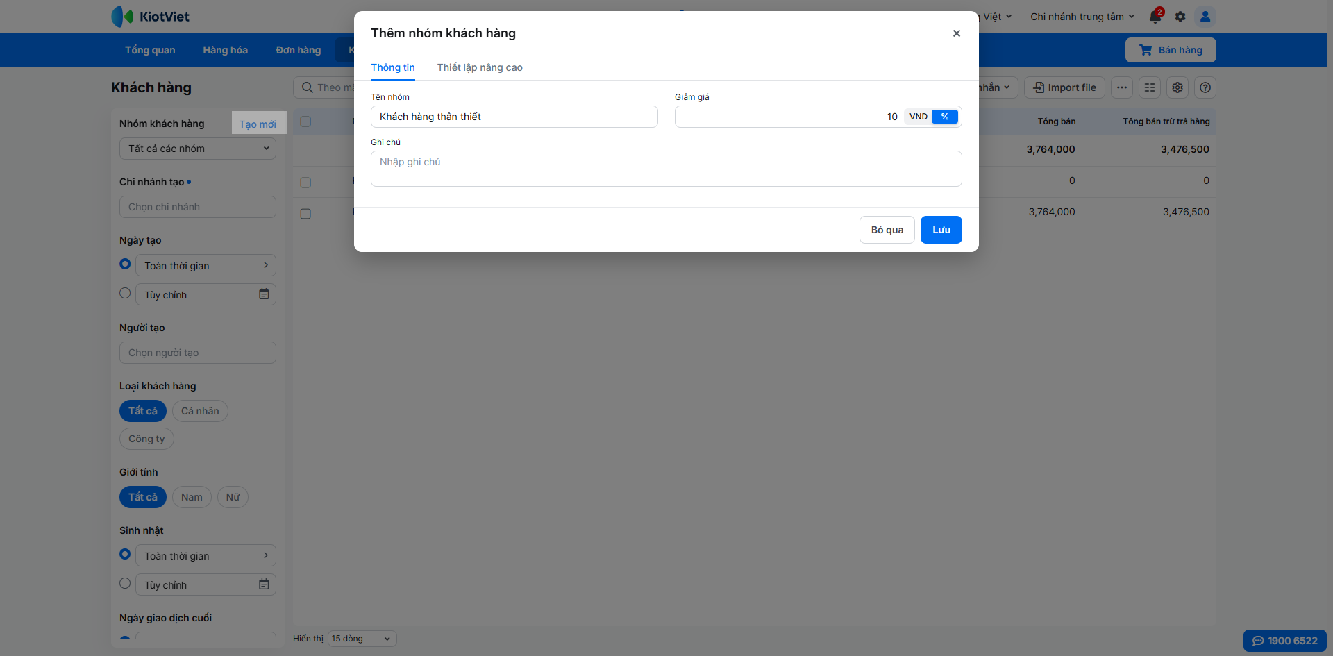 - Đặt tên nhóm là “Khách hàng thân thiết” và nhập mức giảm giá là 10%.