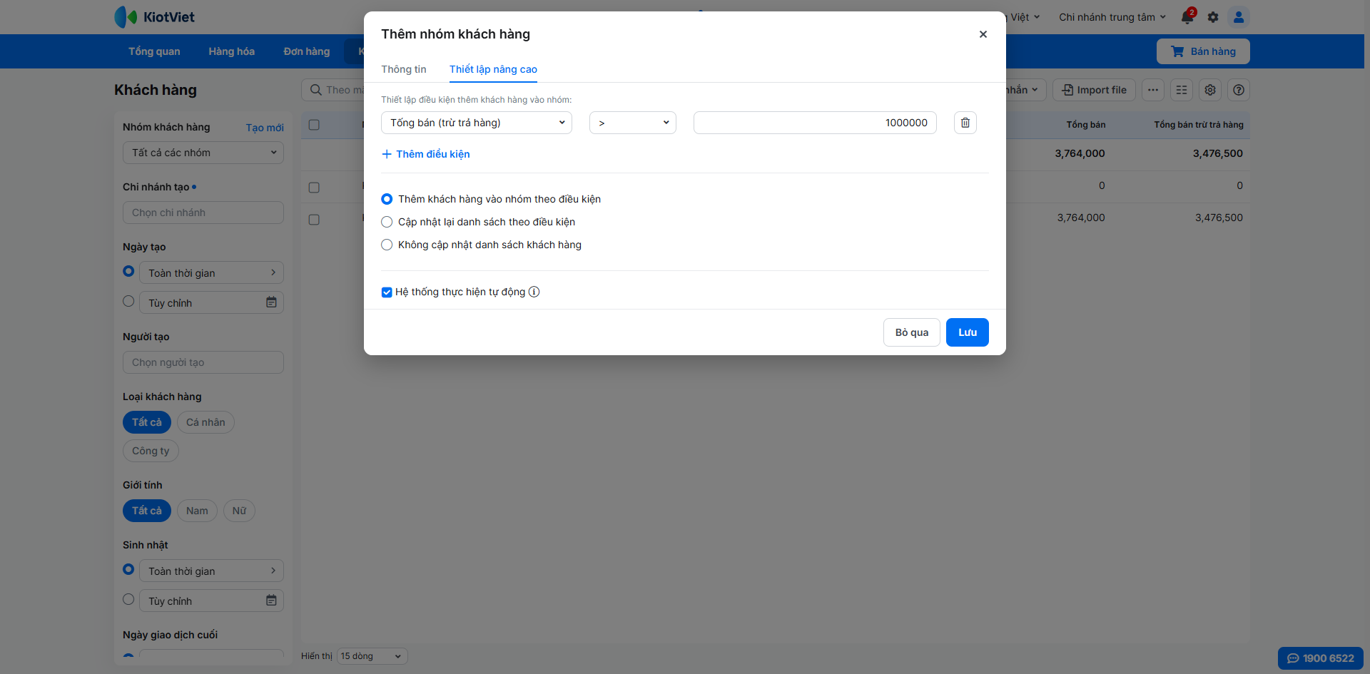 - Đặt điều kiện để tự động thêm khách vào nhóm khi Tổng bán trừ trả hàng lớn hơn 1,000,000 VNĐ.