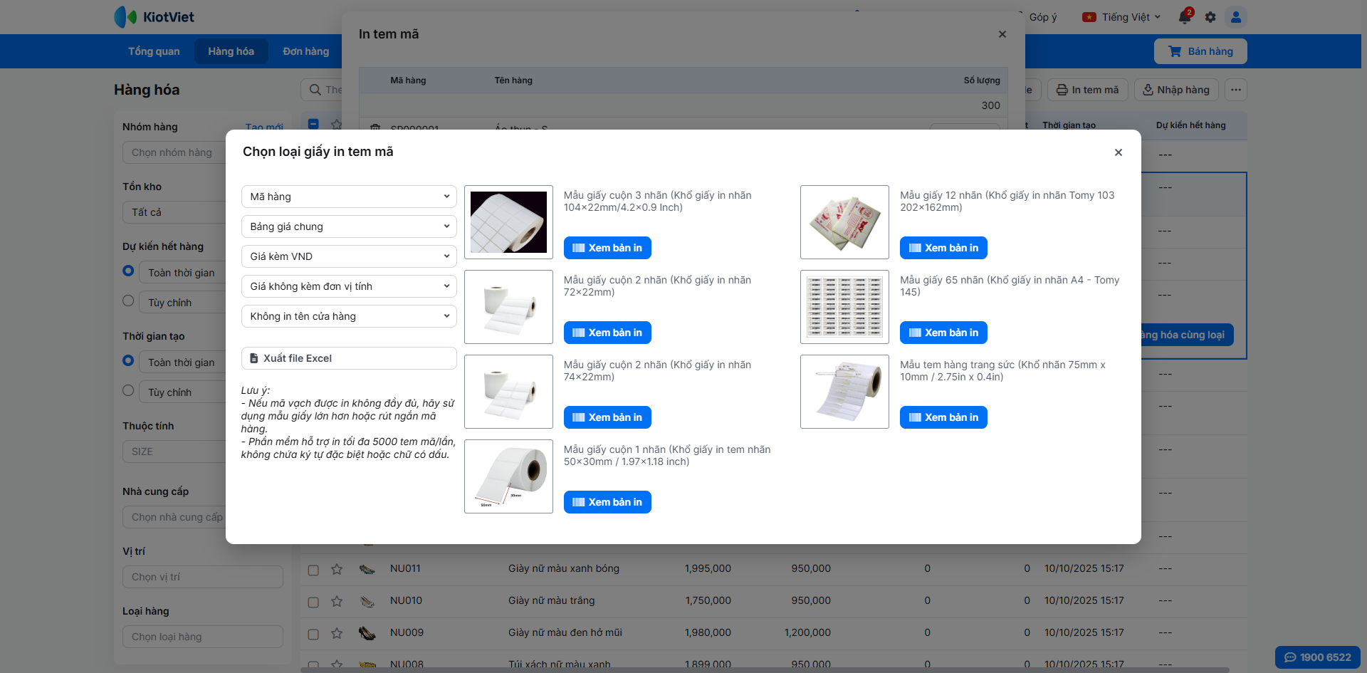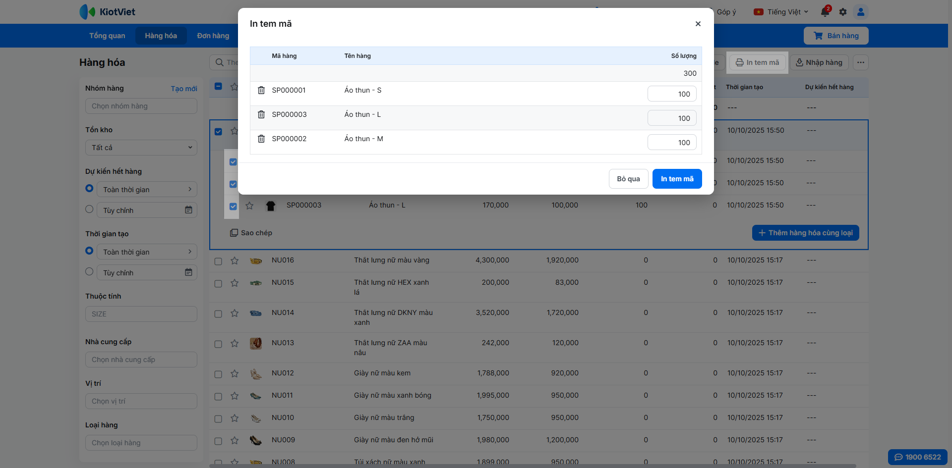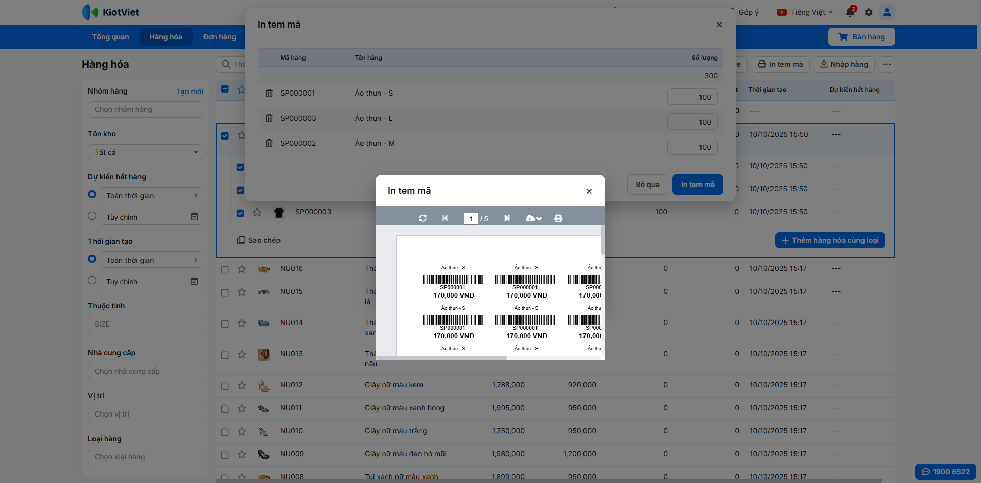 - Tem in ra sẽ có đầy đủ thông tin như: tên sản phẩm, size, giá bán và mã vạch riêng biệt.