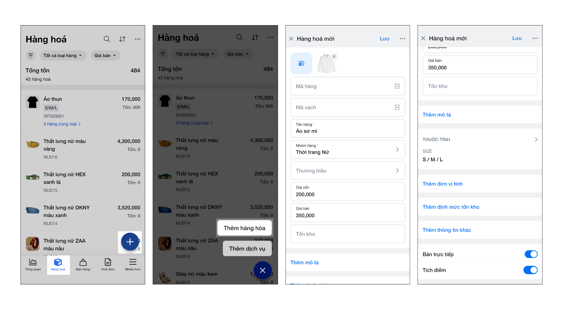 - Tình huống: Bạn cần tạo mới một sản phẩm và nhập hàng cho sản phẩm đó ngay trên ứng dụng di động.