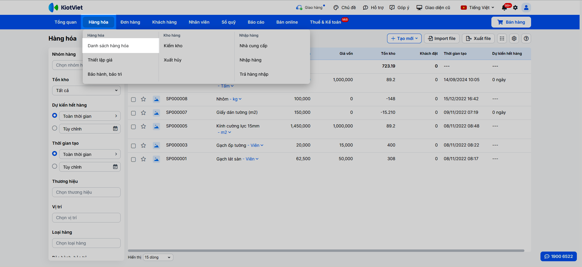 - Bạn truy cập vào menu Hàng hóa → Danh sách hàng hóa.