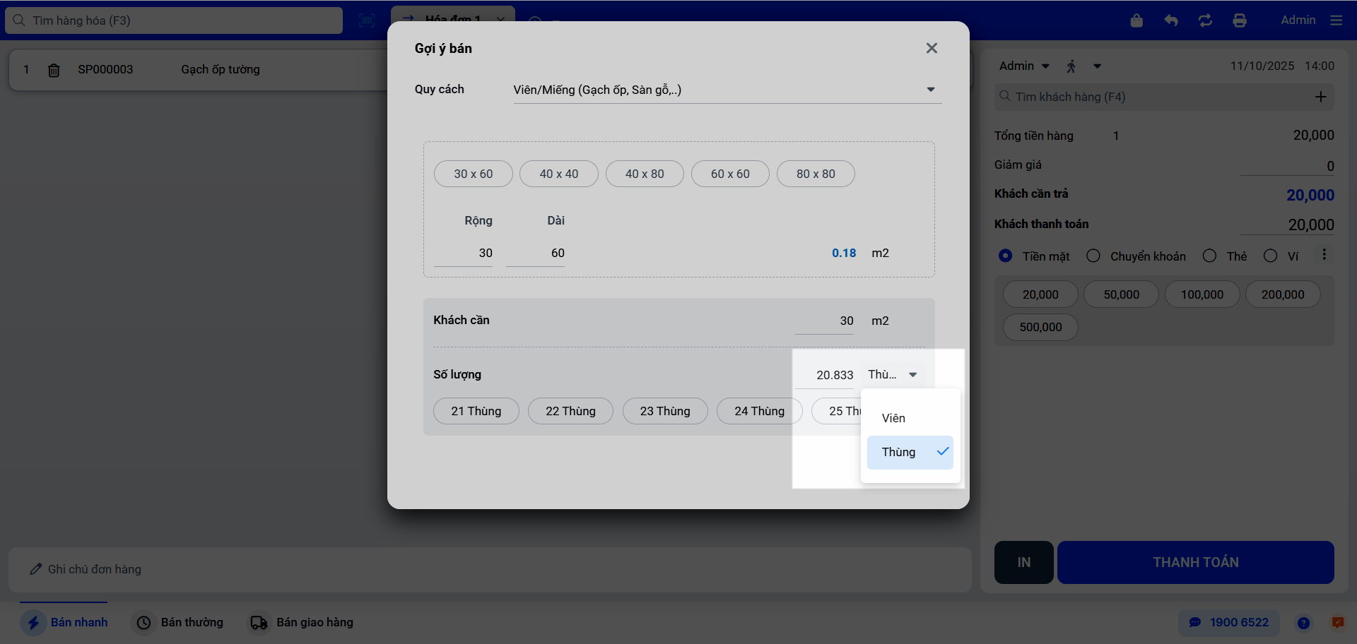 2. Bán hàng theo quy cách Viên/Miếng (Áp dụng cho Gạch, Sàn gỗ,…)