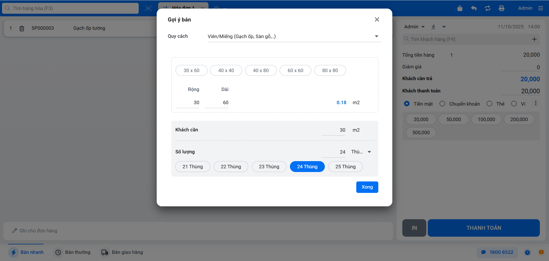 - Trên màn hình Bán hàng, thêm sản phẩm gạch vào hóa đơn.