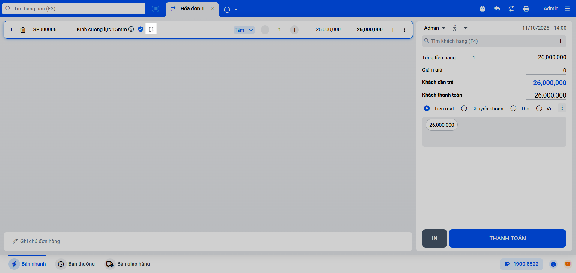 - Trên màn hình Bán hàng, thêm sản phẩm kính vào hóa đơn.