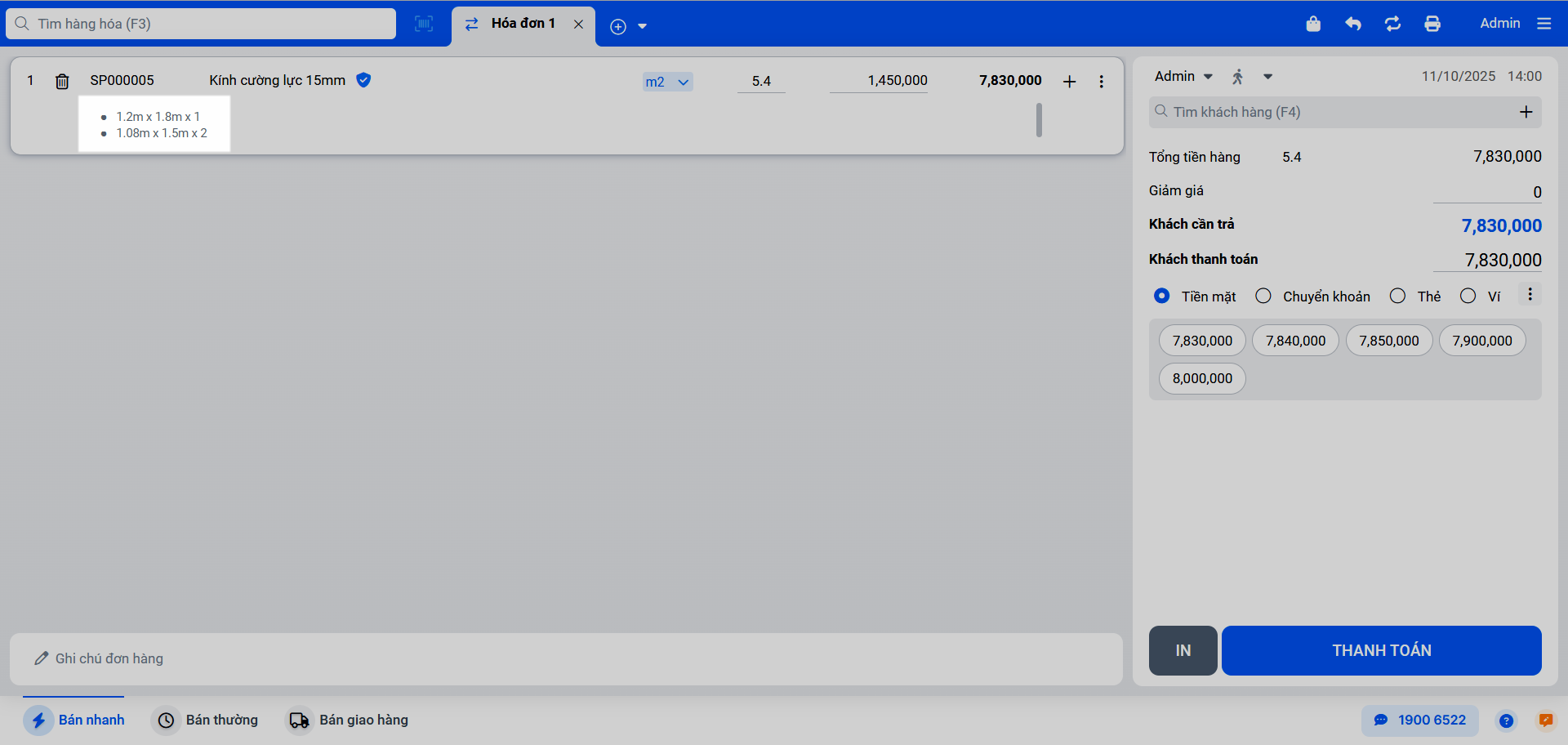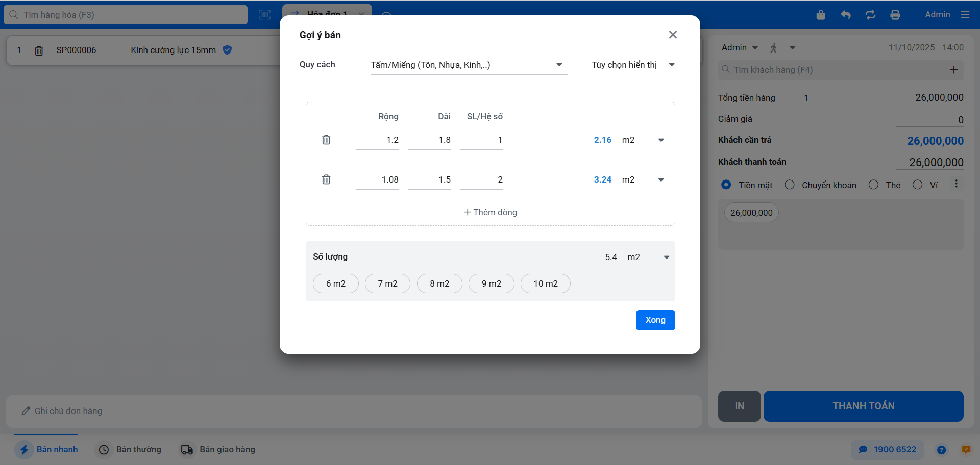 - Tình huống: Sau khi tính toán và thêm sản phẩm vào hóa đơn, bạn muốn các thông tin chi tiết về kích thước (ví dụ: “1 ô kính rộng 1.2m x dài 1.8m”) được thể hiện rõ ràng trên hóa đơn in ra cho khách hàng.