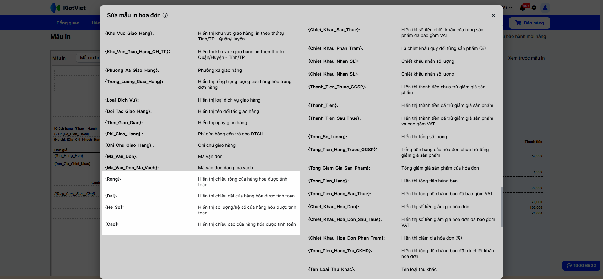 - Thao tác thực hiện như sau: Để thông tin về chiều dài, rộng, cao, hệ số của hàng hóa hiển thị trên hóa đơn, bạn cần đảm bảo mẫu in của mình có chứa token {Rong}, {Dai}, {He_So}, {Cao}.