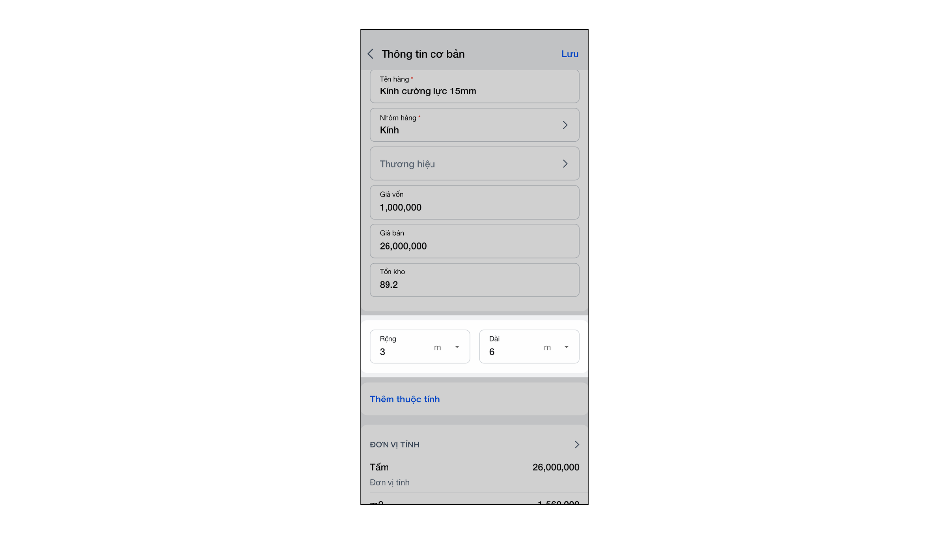 - Trong menu Hàng hóa trên ứng dụng KiotViet, khi tạo mới/ sửa hàng hóa, bạn nhập thông tin Rộng và Dài cho sản phẩm.