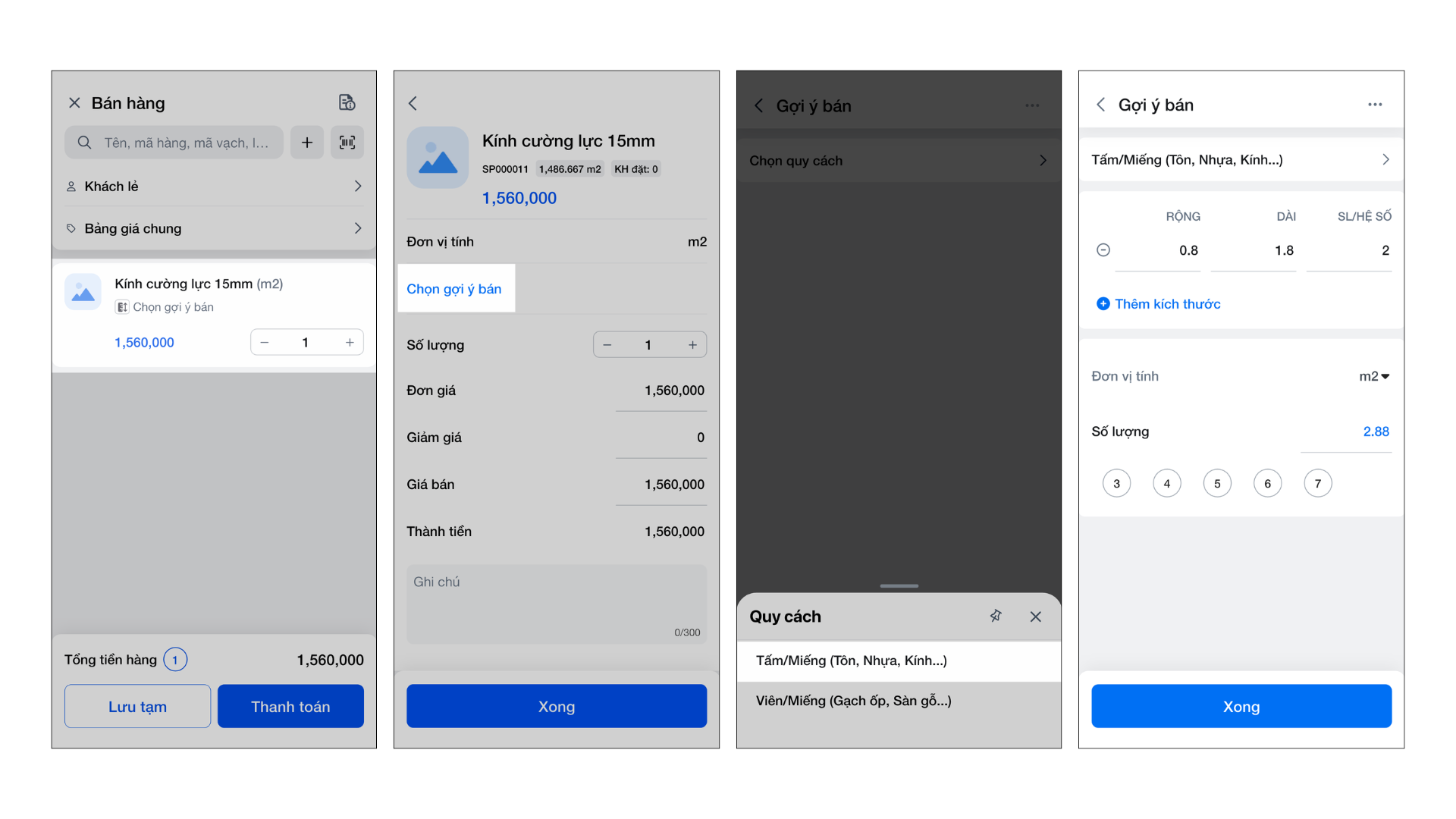 3. Bán hàng theo quy cách Tấm/Miếng (Áp dụng cho Tôn, Kính,…)