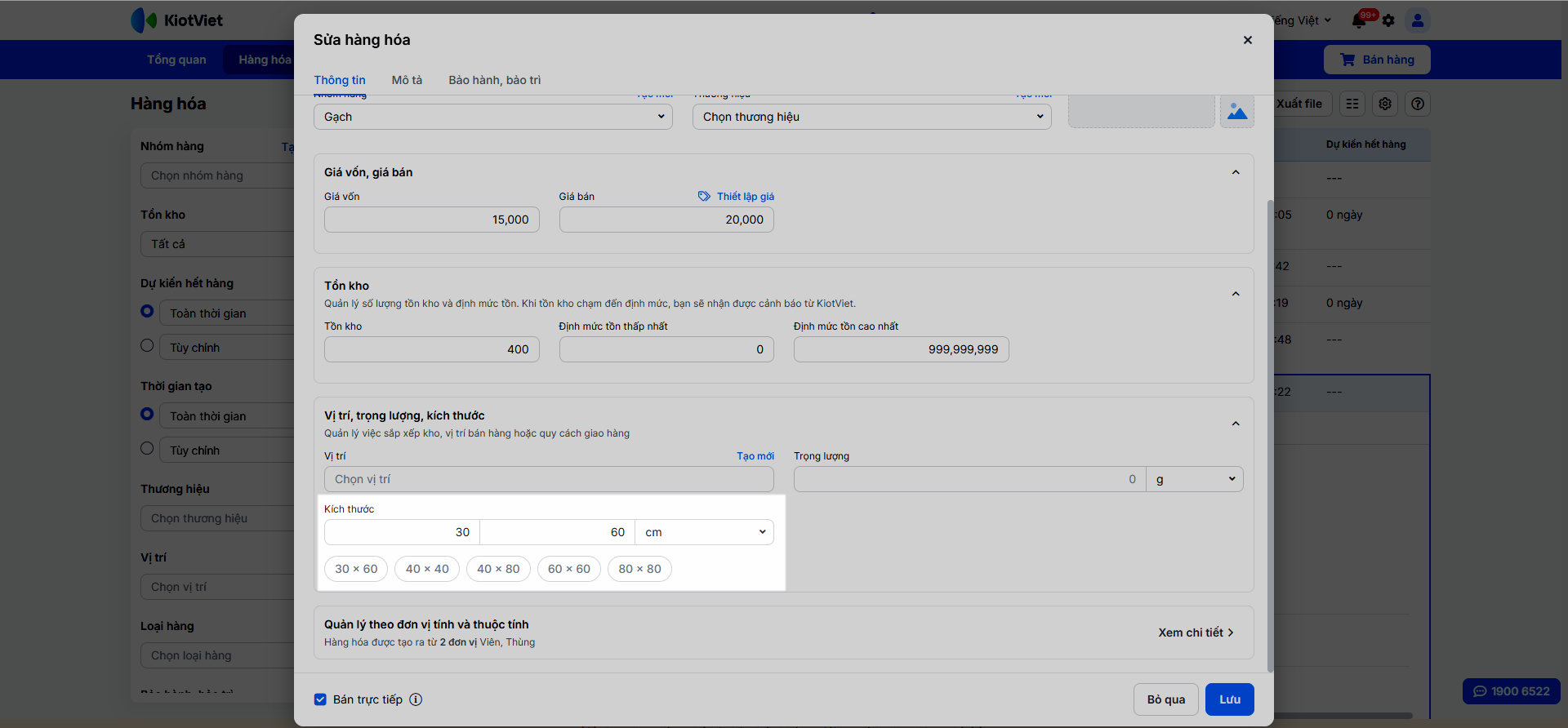 Đối với hàng hóa có tên chứa từ “gạch”, hệ thống sẽ gợi ý các kích thước phổ biến để bạn chọn nhanh.