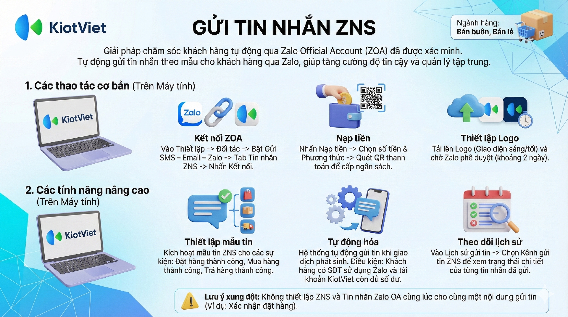 KiotViet tích hợp với Zalo Official Account (ZOA) để hỗ trợ tính năng Chăm sóc khách hàng (CSKH) nâng cao, cho phép bạn gửi tin nhắn ZNS (Zalo Notification Service) cho khách hàng theo các mẫu có sẵn.