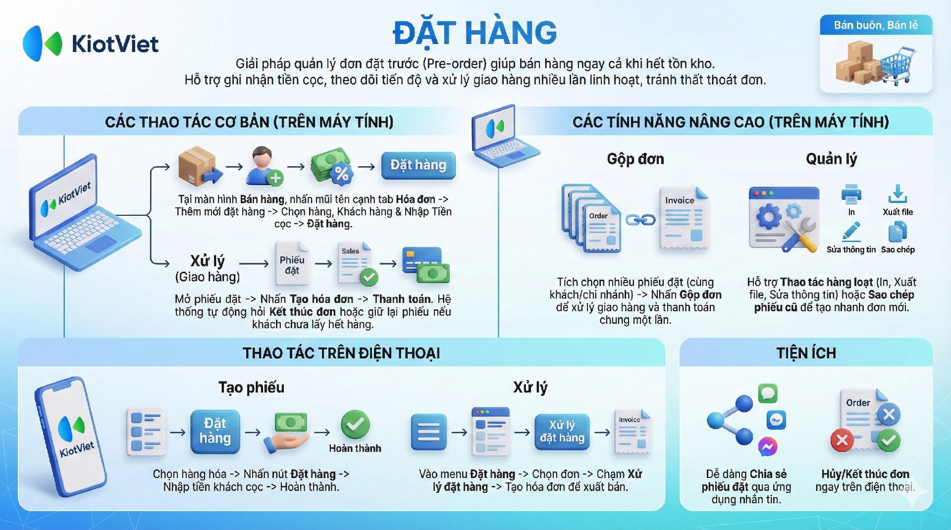 Tính năng Đặt hàng trên KiotViet là một công cụ mạnh mẽ, giúp bạn tối ưu hóa quy trình kinh doanh với 3 lợi ích chính: