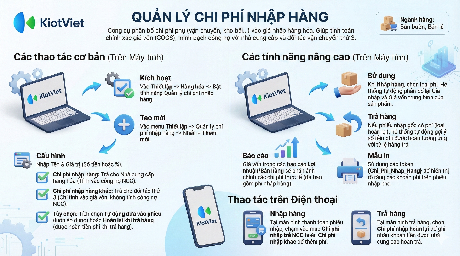 Tính năng Quản lý Chi phí nhập hàng là một công cụ hữu ích giúp bạn hạch toán chính xác các khoản chi phí phát sinh ngoài tiền hàng (như phí vận chuyển, bốc dỡ), từ đó tính toán đúng giá vốn và lợi nhuận kinh doanh.