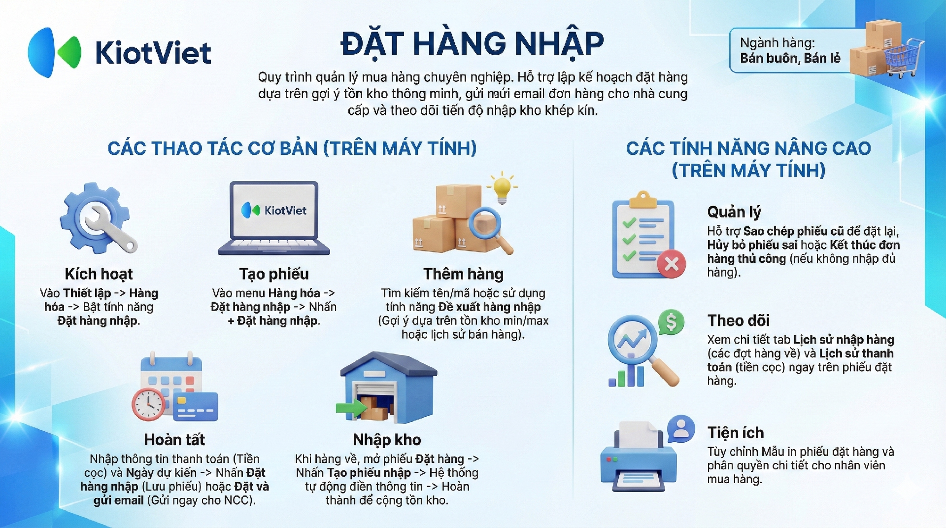 Tính năng Đặt hàng nhập giúp bạn quản lý toàn bộ quy trình làm việc với nhà cung cấp một cách chuyên nghiệp và khép kín, từ khâu lên kế hoạch đặt hàng, gửi đơn, theo dõi xác nhận, nhập kho cho đến khi hoàn tất giao dịch.