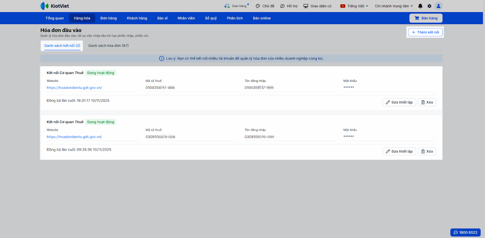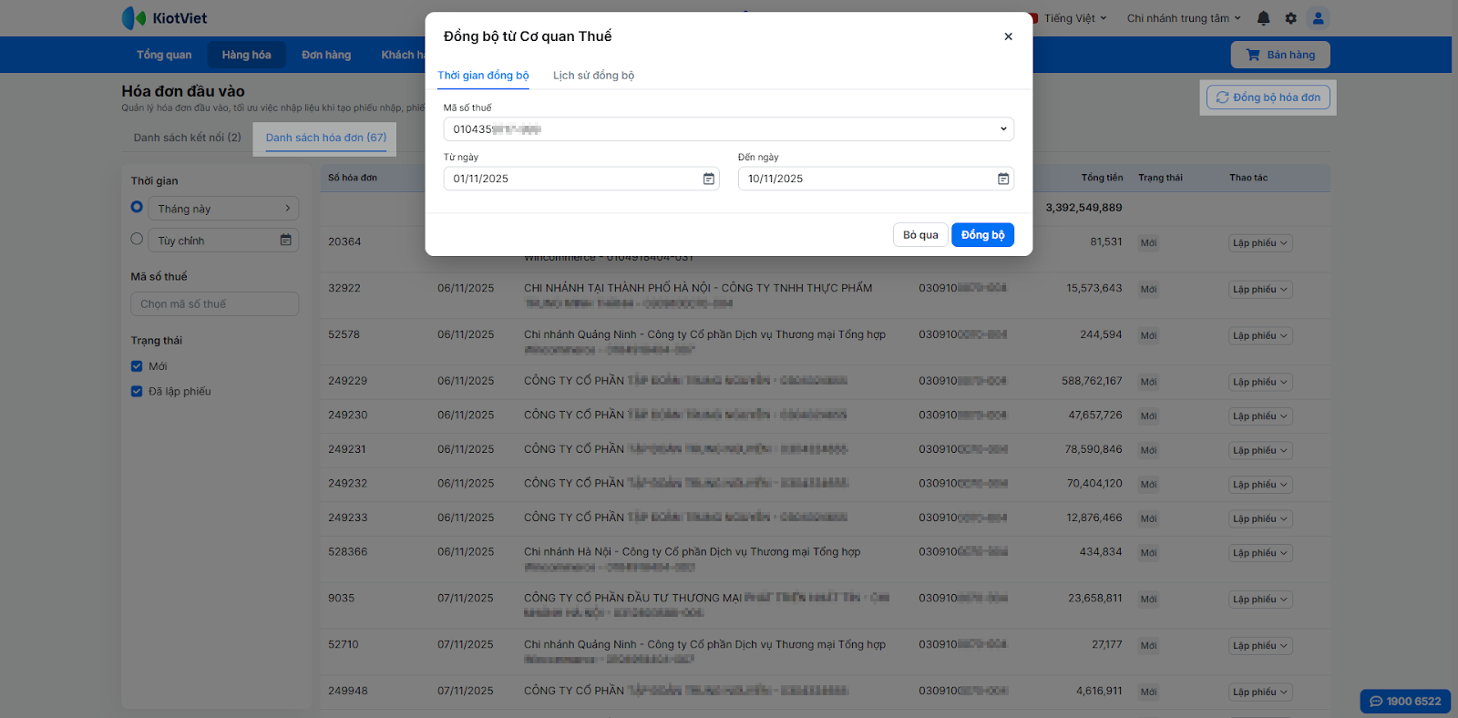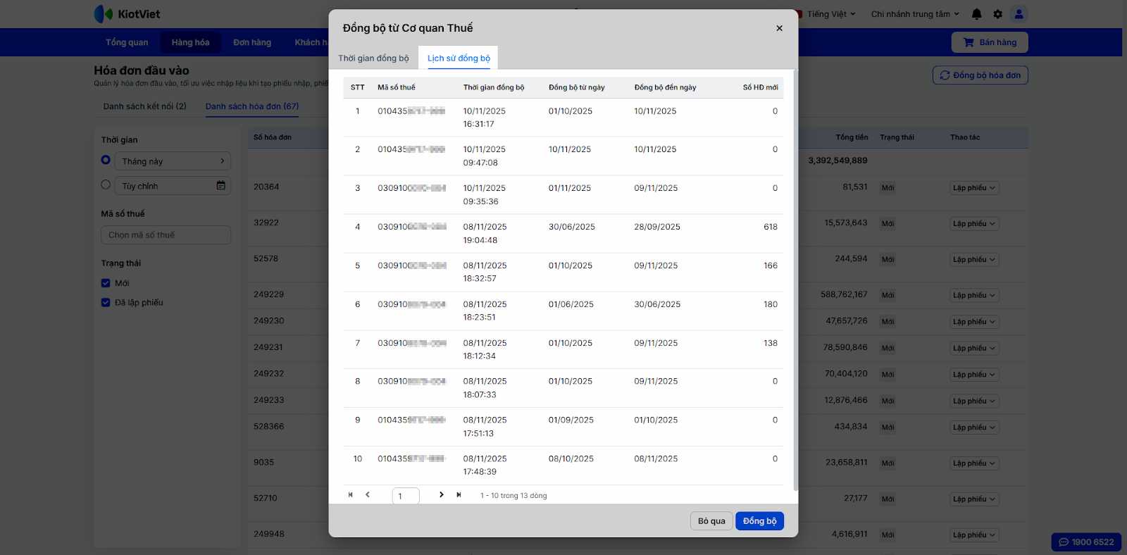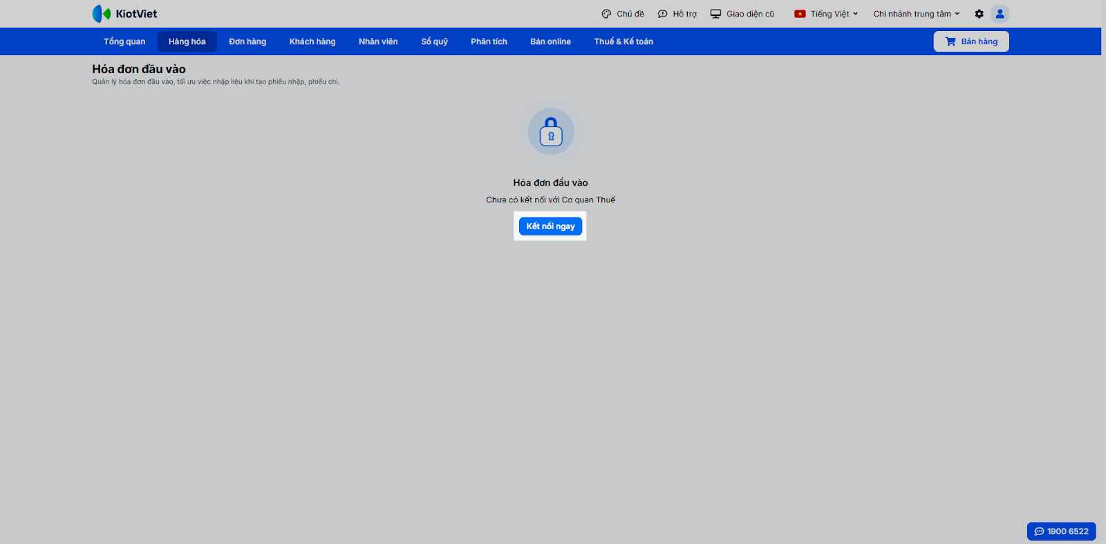 - Tình huống: Sau khi kết nối thành công, bạn muốn tải danh sách các hóa đơn đầu vào (hóa đơn mua hàng) từ TCT về KiotViet.