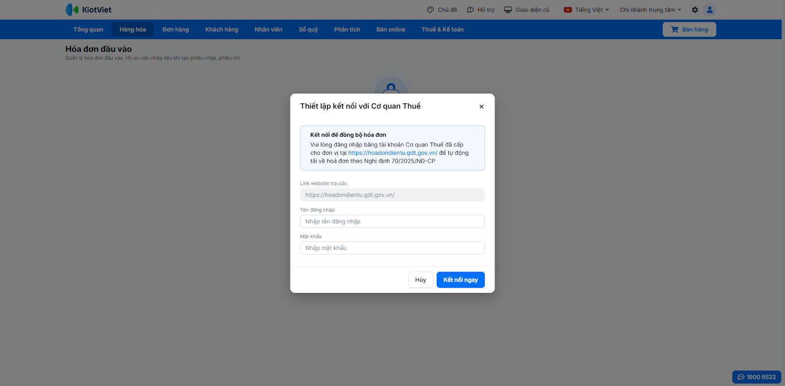 - Tình huống: Để bắt đầu sử dụng tính năng, bạn cần thiết lập kết nối giữa KiotViet và tài khoản tra cứu hóa đơn của doanh nghiệp bạn trên Cơ quan Thuế.