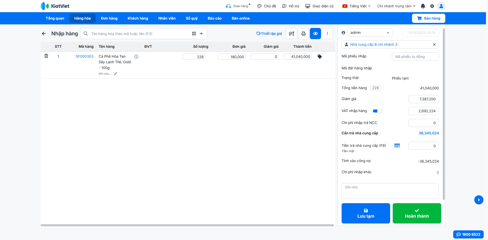 (5) Bạn nhấn Lưu tạm (để lưu phiếu tạm) hoặc Hoàn thành (để hoàn tất phiếu nhập hàng).