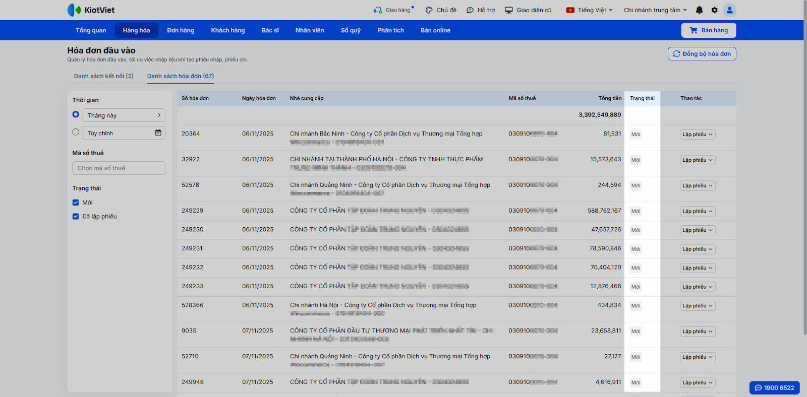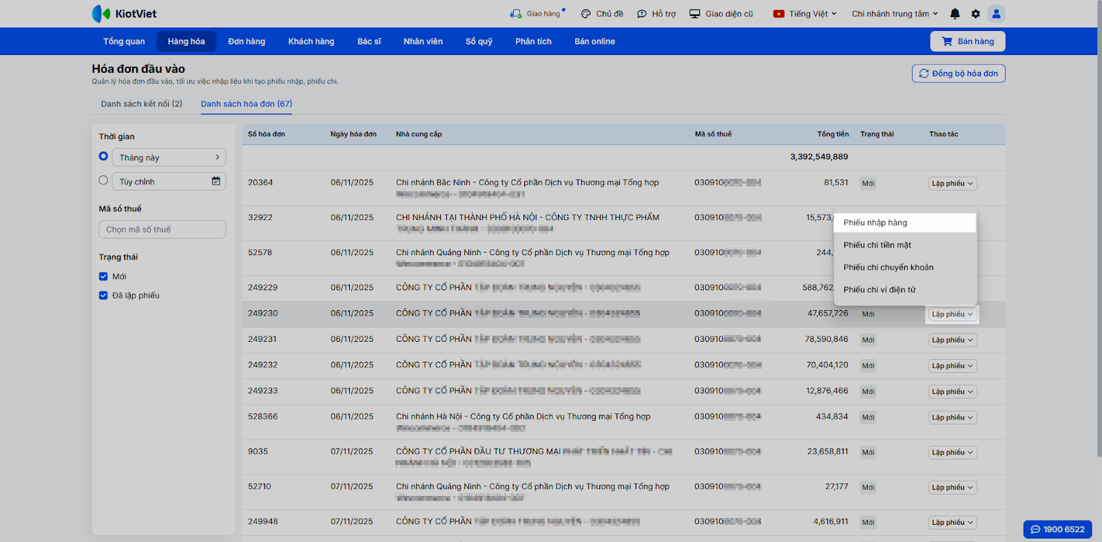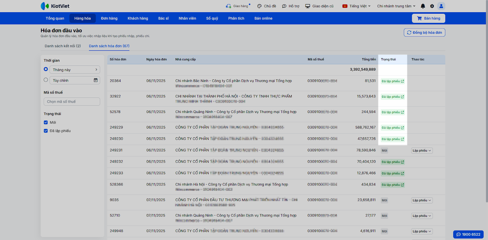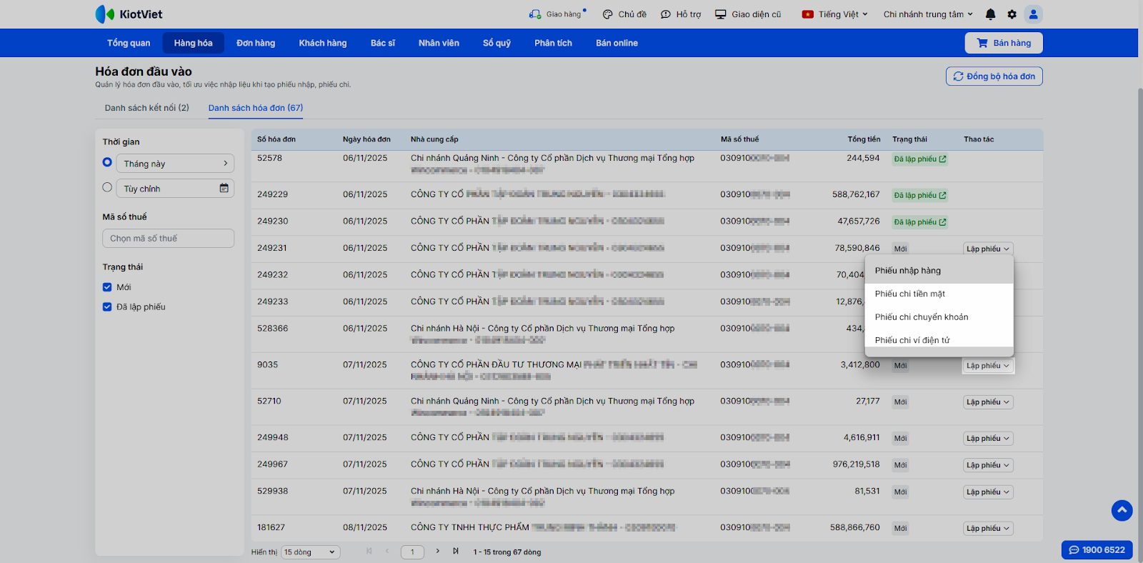 - Quản lý tập trung: Giúp chủ cửa hàng và bộ phận kế toán dễ dàng đối soát công nợ với nhà cung cấp, liên kết chặt chẽ giữa hóa đơn điện tử và phiếu nhập hàng trong KiotViet.