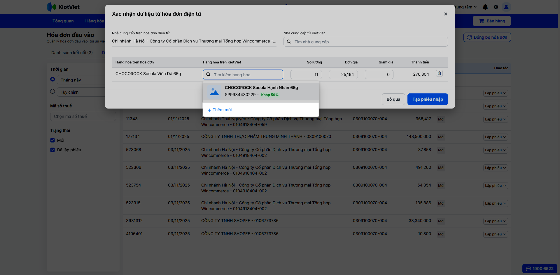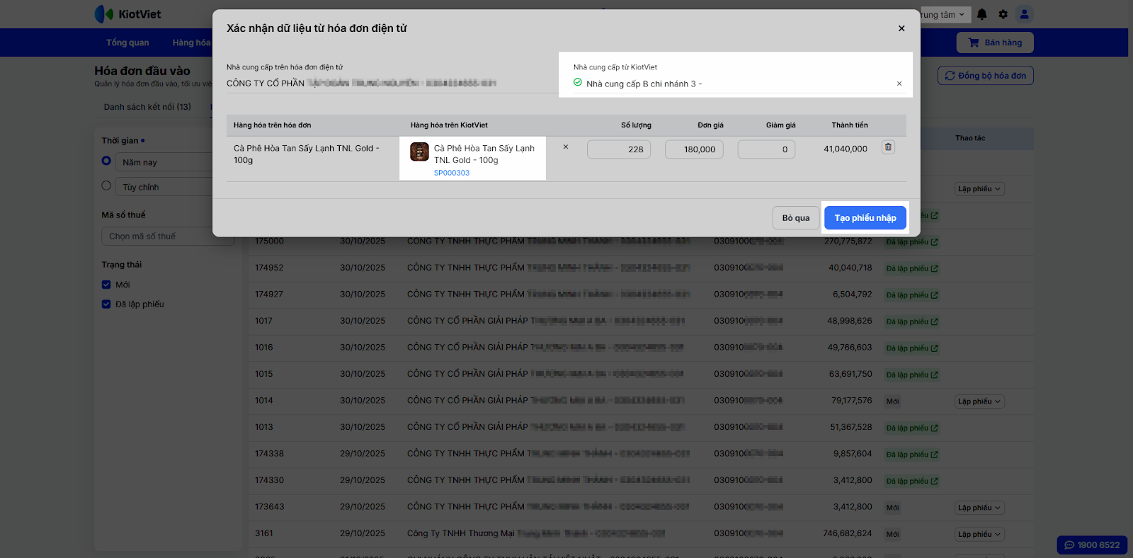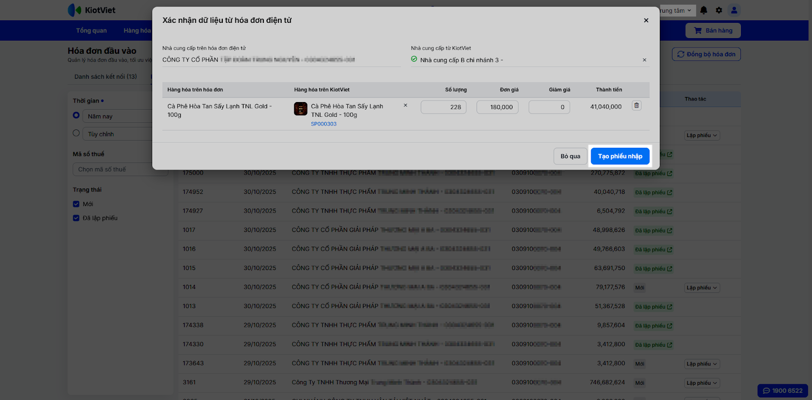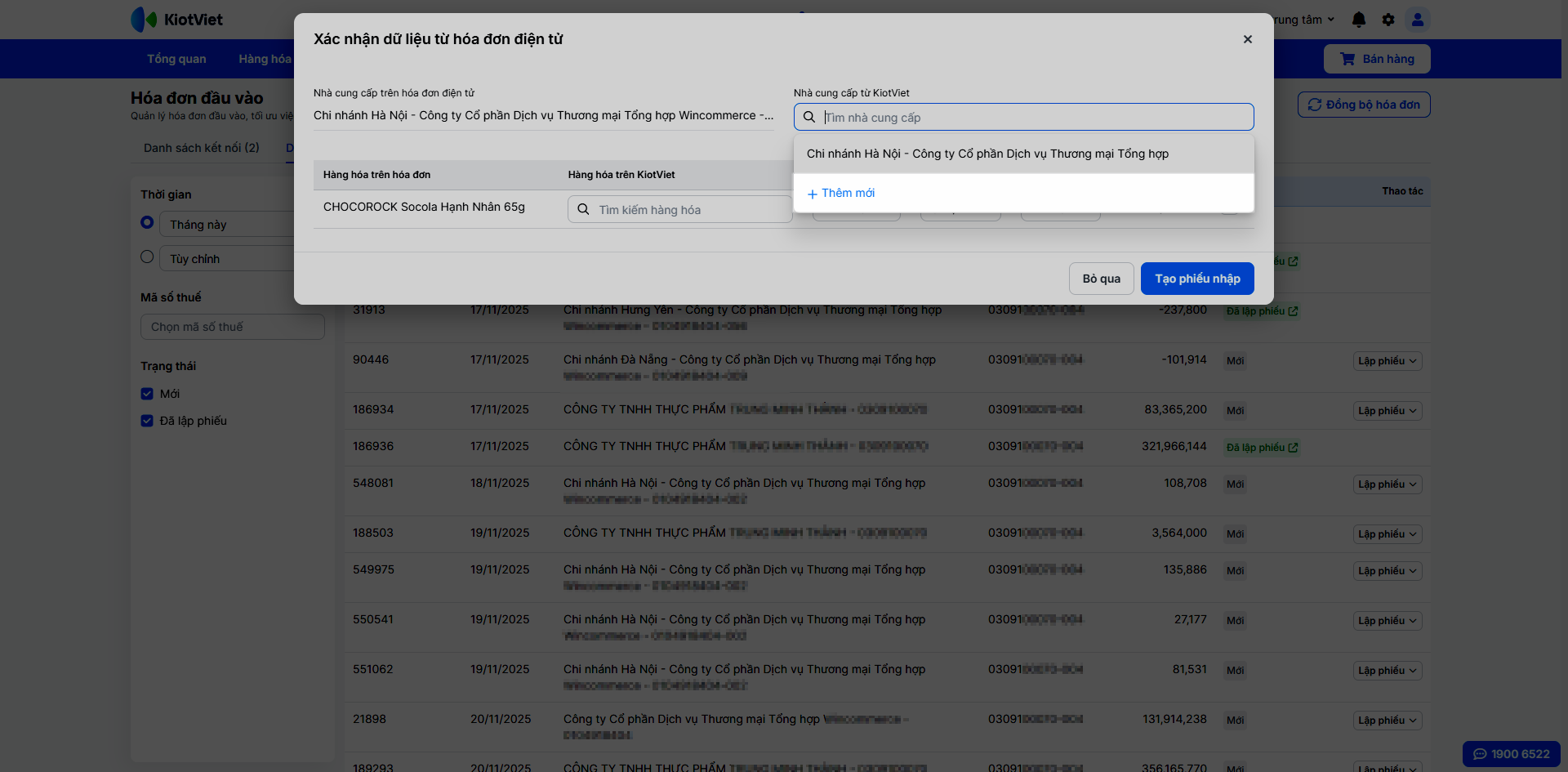 (1) Tại popup Xác nhận dữ liệu từ hóa đơn điện tử, bạn nhấn Tạo phiếu nhập.