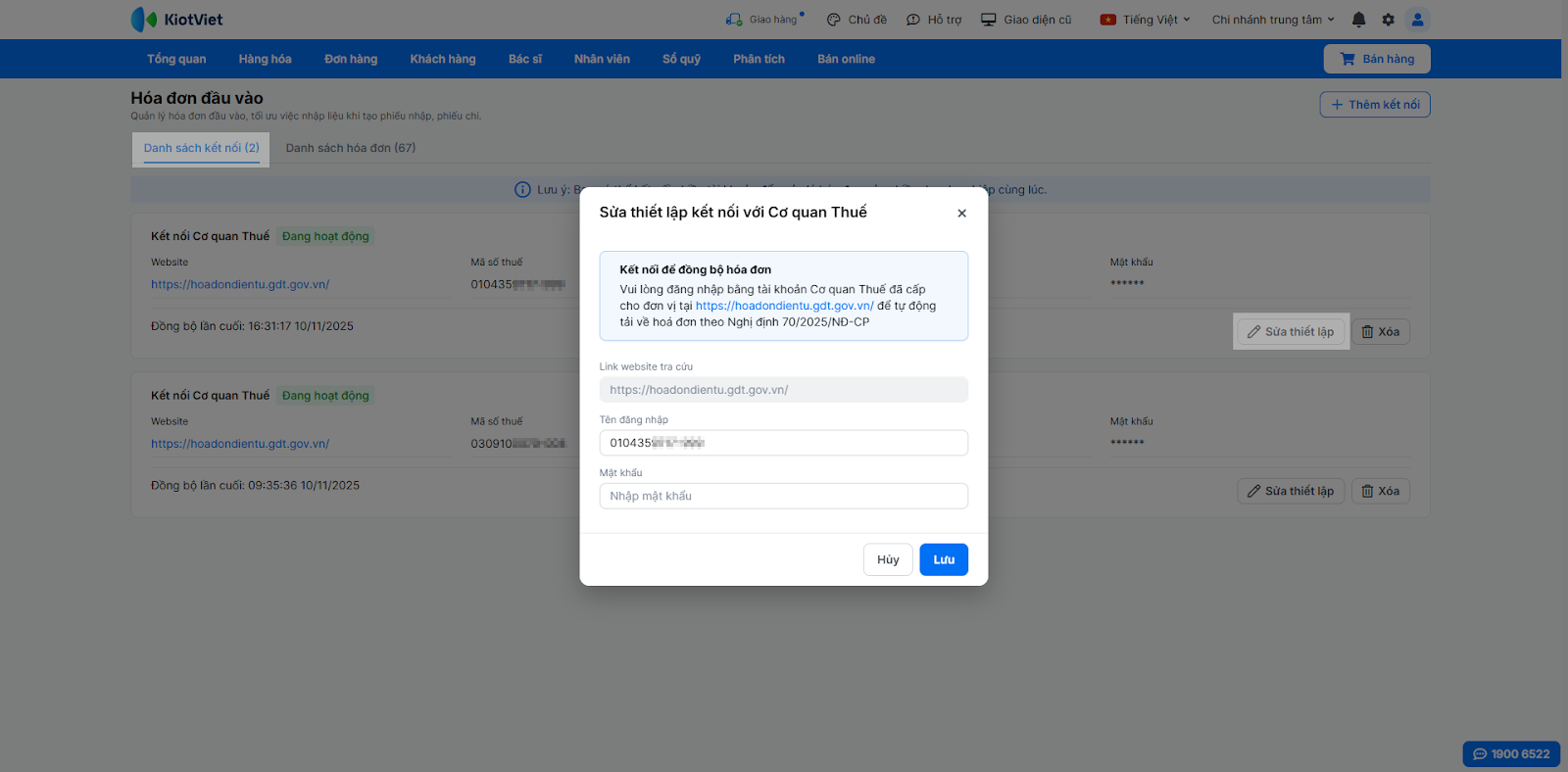 - Tình huống: Khi bạn thay đổi mật khẩu tài khoản tra cứu trên trang Cơ quan Thuế, bạn cần cập nhật lại thông tin này trên KiotViet để duy trì kết nối.