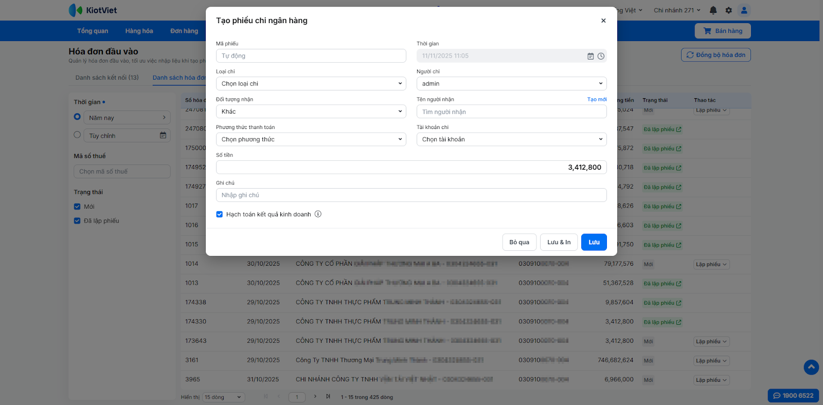 - Tình huống: Nếu hóa đơn này là hóa đơn dịch vụ (không cần nhập kho) hoặc bạn muốn ghi nhận thanh toán ngay, bạn có thể lập phiếu chi trực tiếp thay vì tạo phiếu nhập.