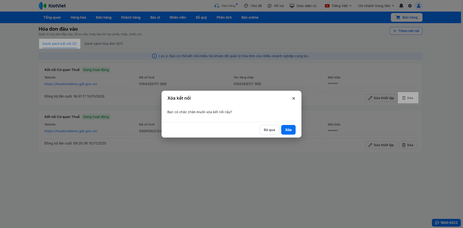 - Tình huống: Khi bạn không muốn sử dụng một tài khoản TCT để đồng bộ nữa, bạn có thể xóa kết nối đó khỏi KiotViet.