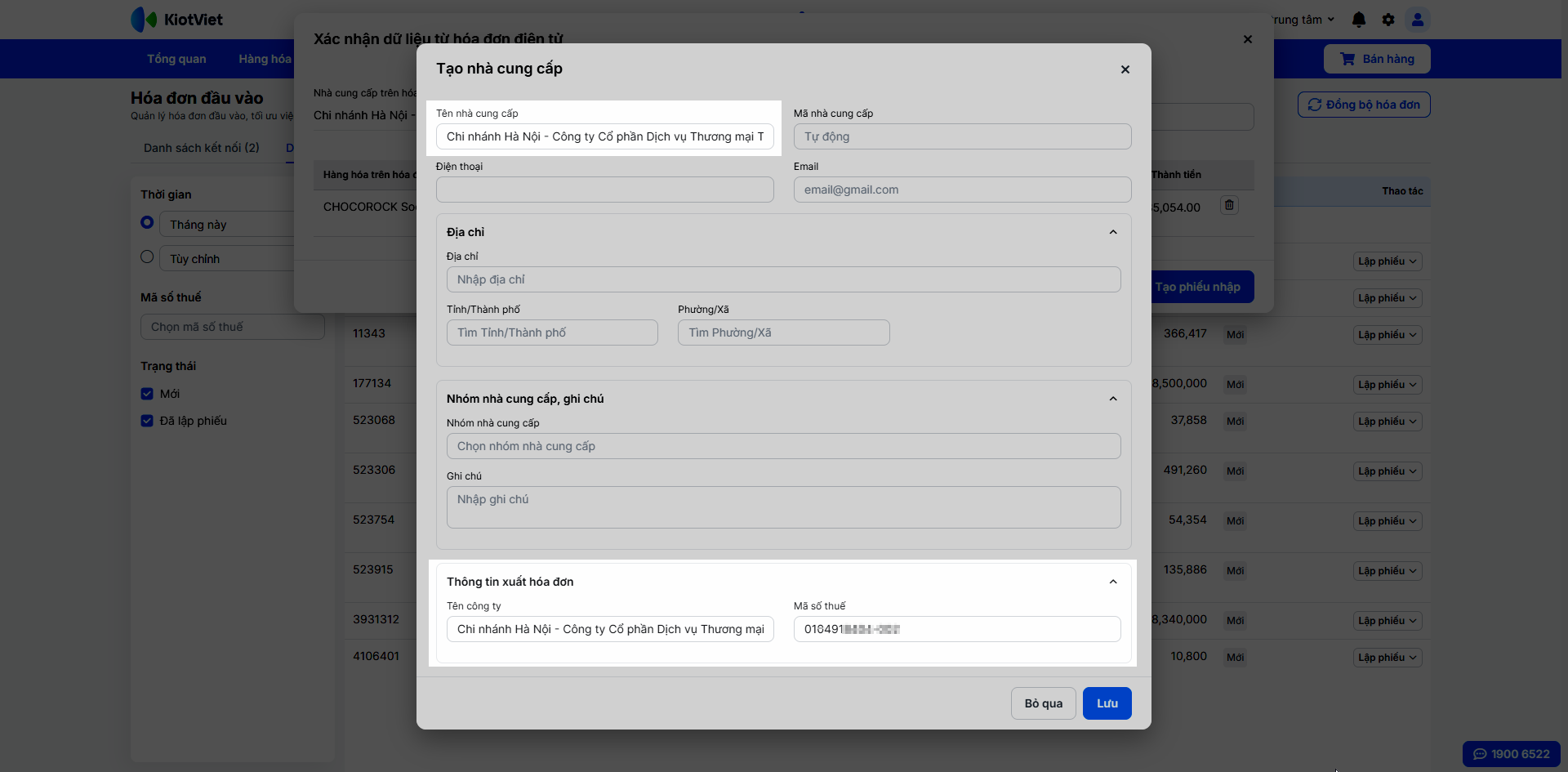 - Hệ thống sẽ tự động tìm và khớp Nhà cung cấp (NCC) trong KiotViet nếu trùng khớp Mã số thuế (MST) hoặc Tên (trên 80%).
