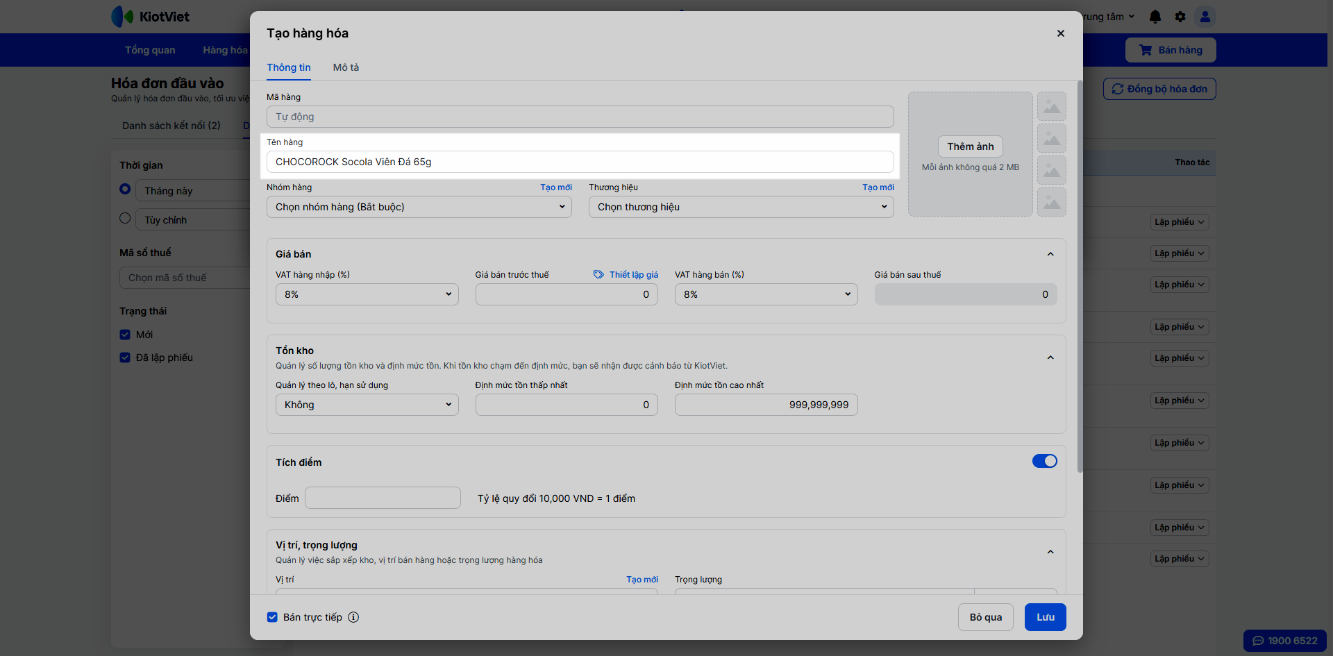 - Nếu hàng hóa chưa khớp, bạn tìm và chọn hàng hóa tương ứng trong danh mục KiotViet của mình, hoặc nhấn + Thêm mới để tạo hàng hóa mới (Tên hàng hóa sẽ được tự động điền từ hóa đơn).