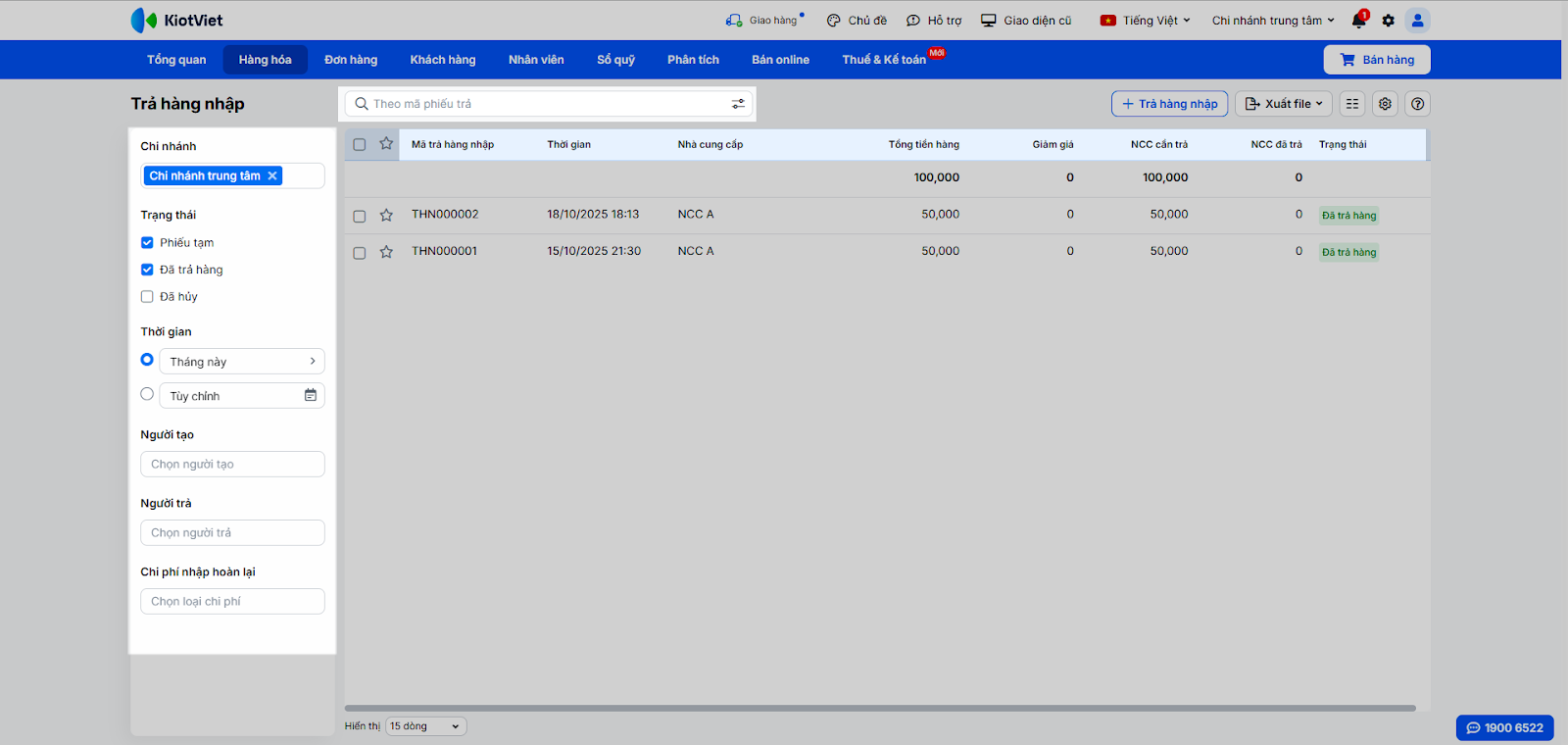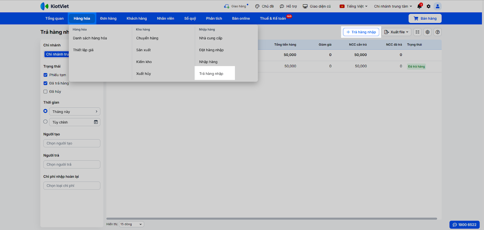 - Vào Hàng hóa → Trả hàng nhập để xem và sử dụng bộ lọc để tìm kiếm theo mã phiếu, nhà cung cấp, trạng thái…