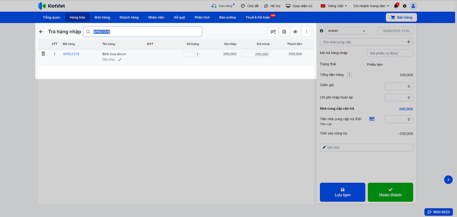 - Thêm hàng hóa vào phiếu trả bằng cách tìm kiếm hoặc quét mã vạch.