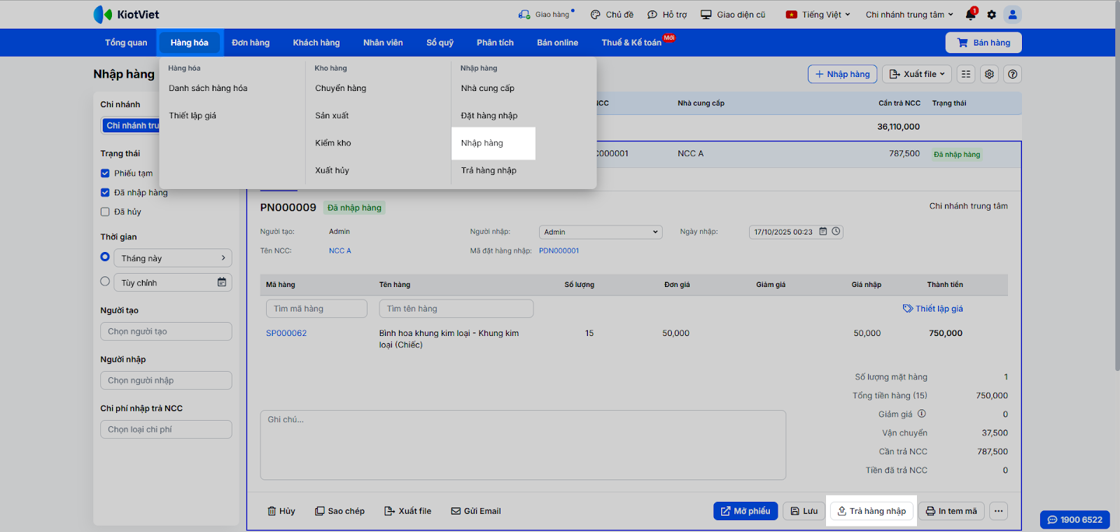 - Tìm và mở chi tiết một phiếu nhập hàng ở trạng thái Đã nhập hàng.