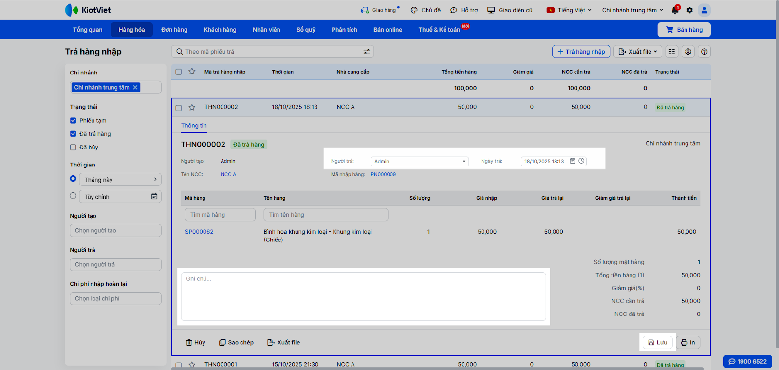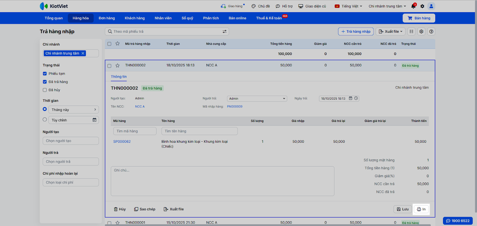 - In: Trong danh sách phiếu Trả hàng nhập, tìm và chọn phiếu → nhấn In