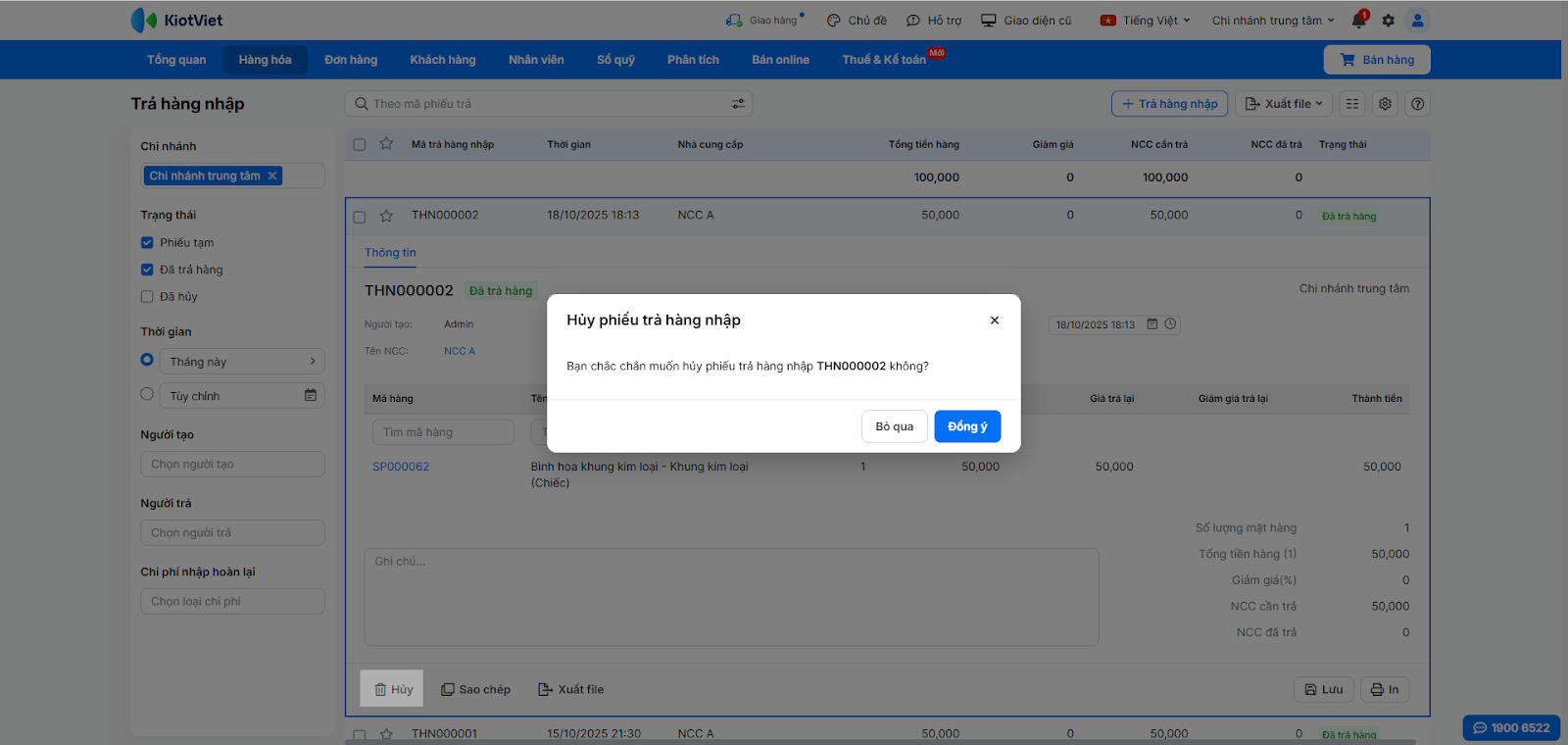 - Hủy: Mở một phiếu đã hoàn thành và nhấn Hủy → nhấn Đồng ý. Thao tác này sẽ cộng lại tồn kho và cập nhật lại công nợ.