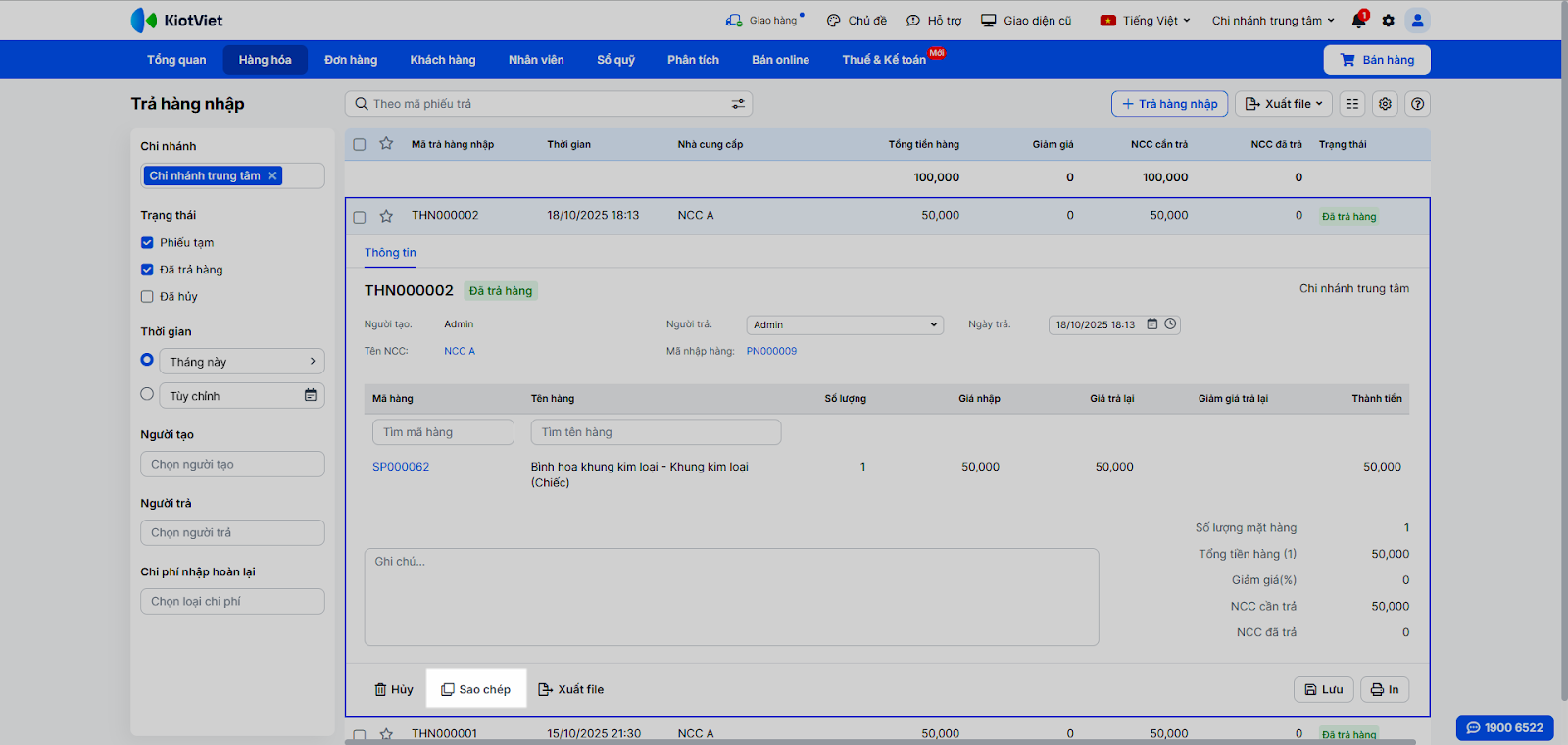 - Tình huống: Bạn cần xem lại, sửa thông tin, hủy hoặc tạo nhanh một phiếu trả hàng mới dựa trên phiếu cũ.