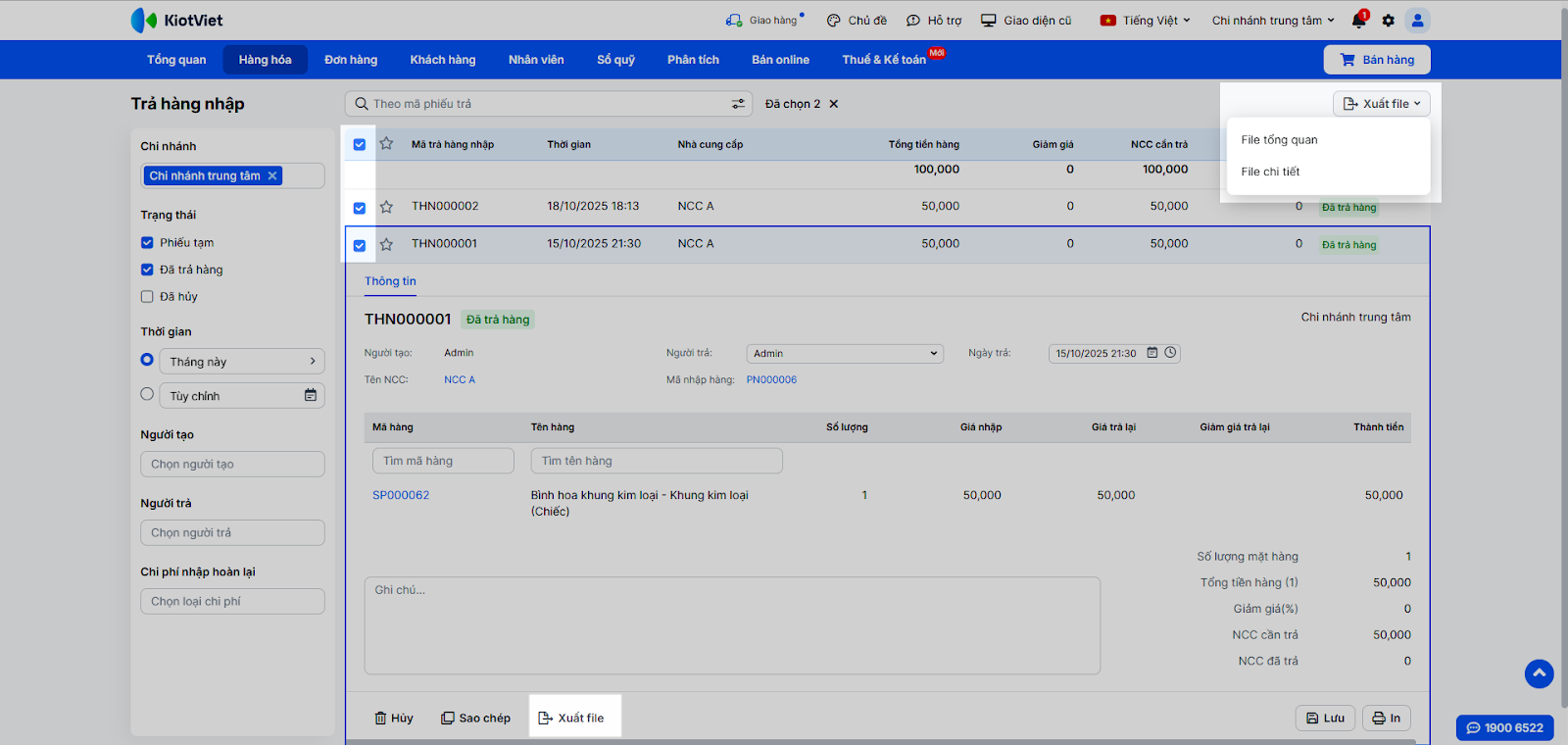 - Xuất file chi tiết phiếu trả hàng nhập: Trong danh sách phiếu Trả hàng nhập, tìm và chọn phiếu → nhấn Xuất file.