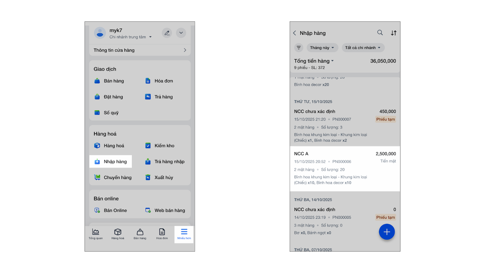 - Mở ứng dụng KiotViet, vào menu Nhiều hơn, chạm Nhập hàng.