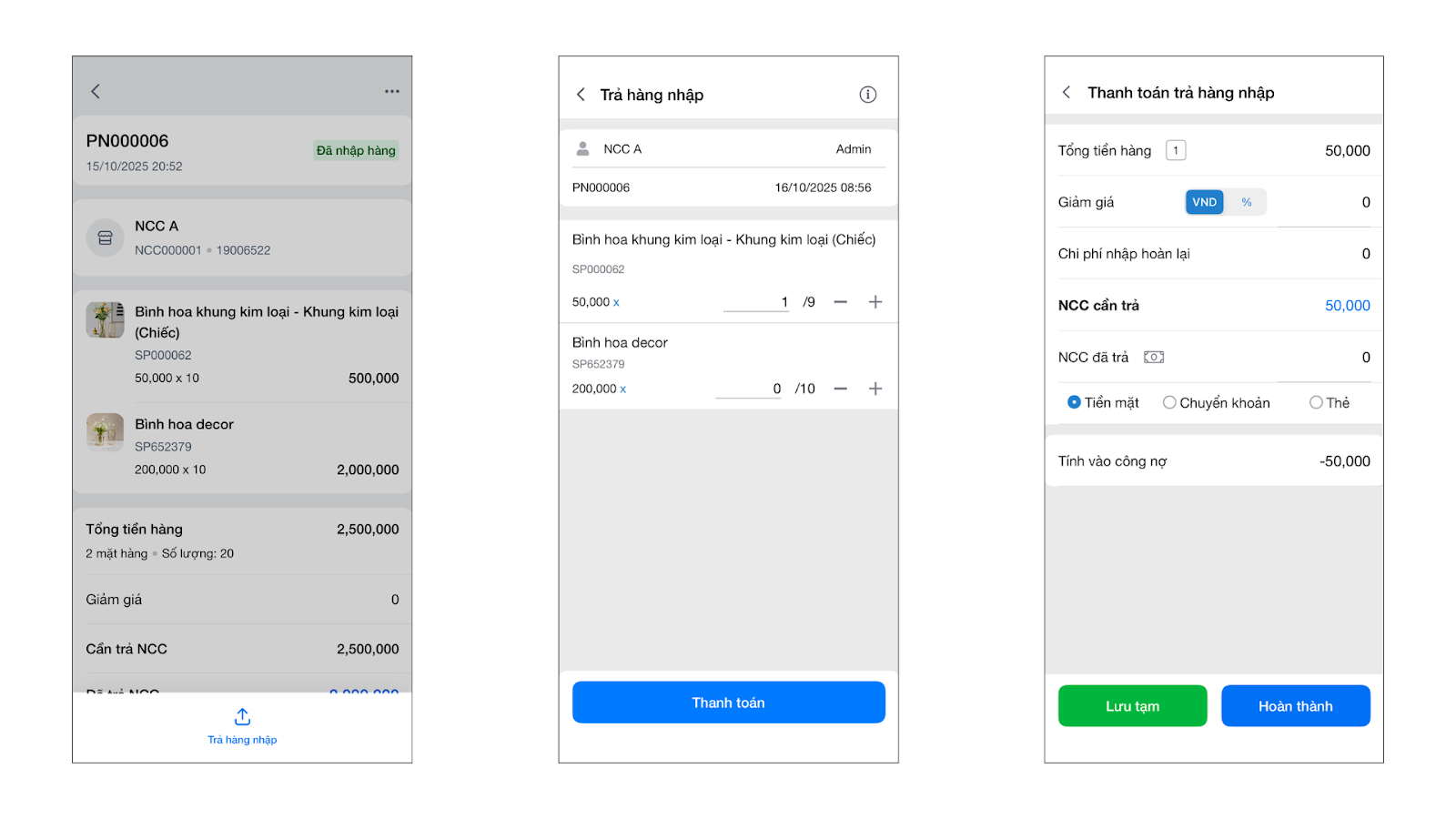 - Chạm Hoàn thành để xác nhận phiếu trả hàng.